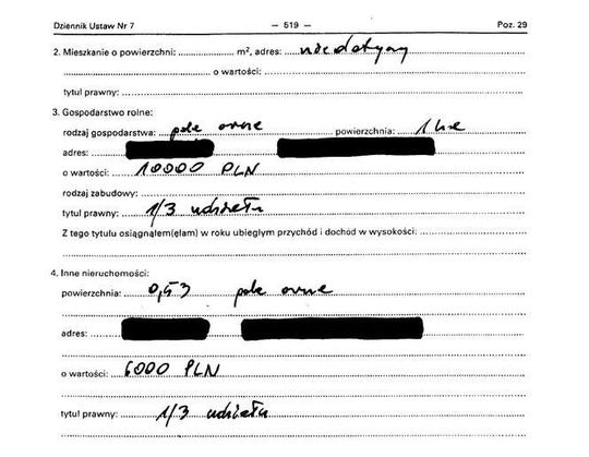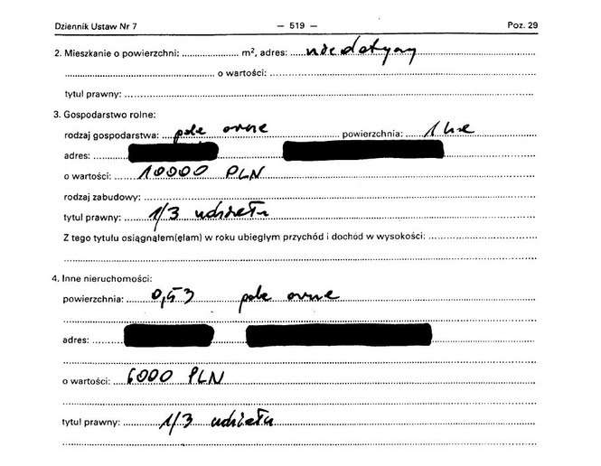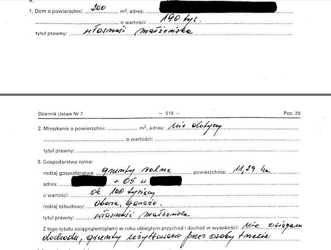 Polisa na życie 20 tys. zł, gospodarstwo rolne 1,5 ha warte 20 tys. zł, garaż 40 tys. zł, działka rekreacyjna 100 tys. zł, dochody 57 tys. zł; mitsubishi carisma z 1999 r. 10 tys. zł.