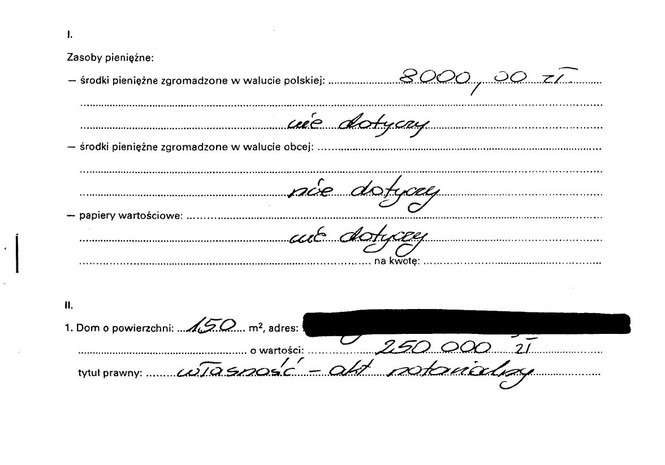 Oszczędności 4 tys. zł, 5/240 udziałów w kamienicy warte 2006 r., pożyczka gotówkowa 17 tys. zł,