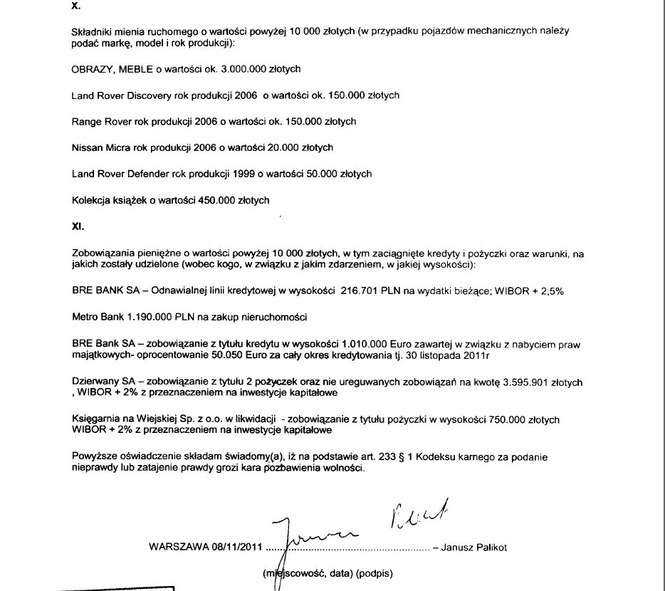 Oszczędności 280 tys. zł, dom 250 mkw. warty 1,25 mln zł, gospodarstwo rolne warte 100 tys. zł, budynek handlowo-usługowo-mieszkaniowy warty 5,5 mln zł, dochody 168 tys. zł, skoda fabia 2010 r. warta 38 tys. zł, nissan patrol 2005 r. warty 65 tys. zł, motocykl yamaha 2010 r. warty 23 tys. zł, kredyt 1,15 mln zł.