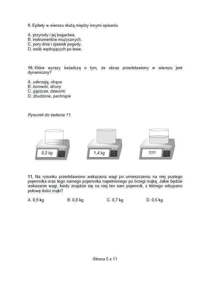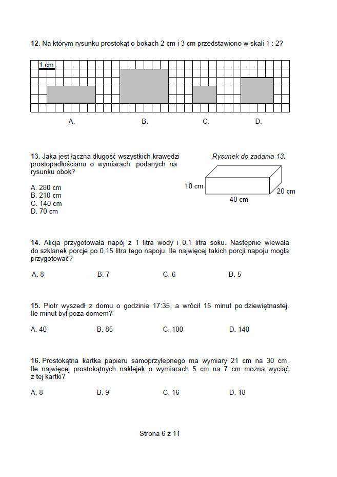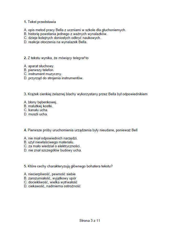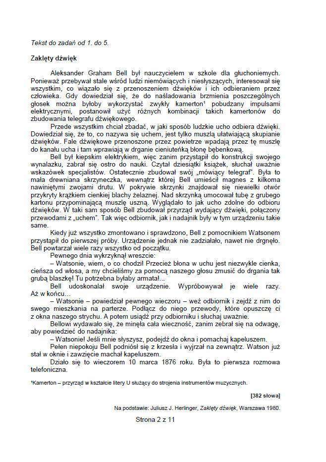 Sprawdzian szóstoklasisty 2014. TEST, ODPOWIEDZI, arkusze Co było na sprawdzianie szóstoklasisty 2014? Uczniowie mieli m.in. zadanie na czytanie ze zrozumieniem - tekst dotyczący wynalezienia telefonu, zadania z matematyki - trzeba było napisać ogłoszenie dotyczące zbiórki książek i zabawek na szkolną loterię oraz należało napisać opowiadanie Co dwie głowy, to nie jedna - dotyczące rozwiązania problemu. Jedna ze szkół nie zgłosiła uczniów do sprawdzianu szóstoklasisty 2014 Zakończył się ogólnopolski sprawdzian dla szóstoklasistów. Jak poinformowała wicedyrektor Centralnej Komisji Egzaminacyjnej Mariola Konopka, egzamin przebiegał prawidłowo, nie odnotowano odstępstw od procedur z wyjątkiem jednej szkoły w woj. łódzkim. Szkoła ta nie dopilnowała obowiązku i nie zgłosiła swoich uczniów do sprawdzianu. W efekcie dziewięcioro uczniów ostatniej klasy będzie musiało pisać sprawdzian w drugim terminie w czerwcu. Sprawdzian szóstoklasisty 2014, zwany kompetencyjnym lub ponadprzedmiotowym, ma skontrolować nie tylko wiedzę ucznia, ale i jego umiejętności. Ma ocenić również, w jakim stopniu uczeń opanował czytanie, pisanie, rozumowanie, jak korzysta z informacji i wykorzystuje wiedzę, w tym liczenie, w praktyce. – W województwie lubelskim pisanie sprawdzianu szóstoklasisty zadeklarowało ponad 20 tys. uczniów, w Lublinie liczba ta wynosi 2 879 – podaje Renata Janicka z lubelskiego biura Okręgowej Komisji Egzaminacyjnej w Krakowie. To ostatni rok sprawdzianu szóstoklasisty 2014 r. będzie ostatnim rokiem, kiedy sprawdzian szóstoklasisty będzie przeprowadzony według formuły obowiązującej od 2002. W przyszłym roku zmienią się zasady tego testu. Odpowiedzi i arkusze - sprawdzian szóstoklasisty 2014 Sprawdzian szóstoklasisty rozpoczął się o godz. 9. Potrwał 60 minut. Dla uczniów, którym przysługuje dostosowanie warunków przeprowadzenia sprawdzianu, może on być przedłużony maksymalnie o pół godziny.