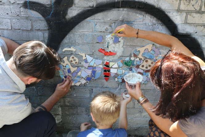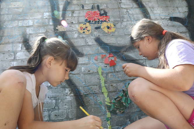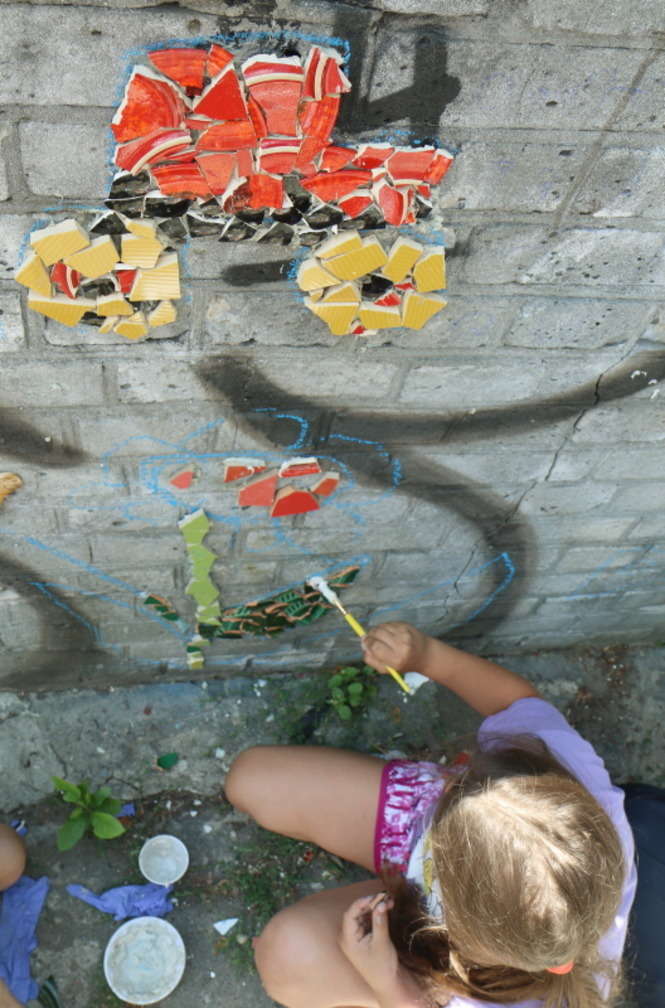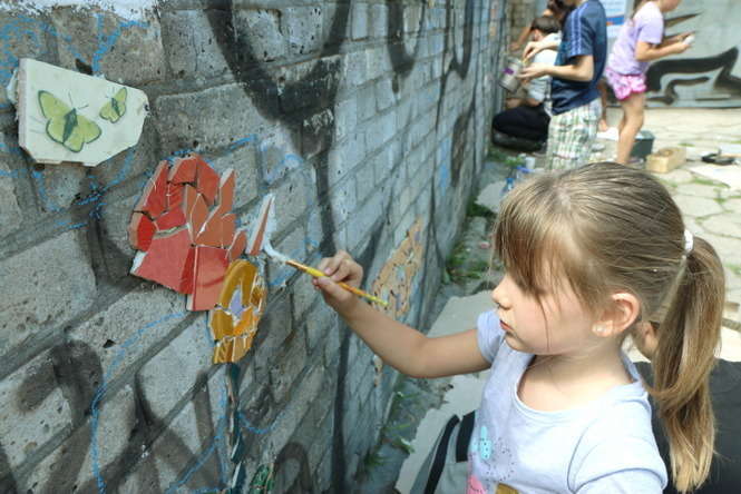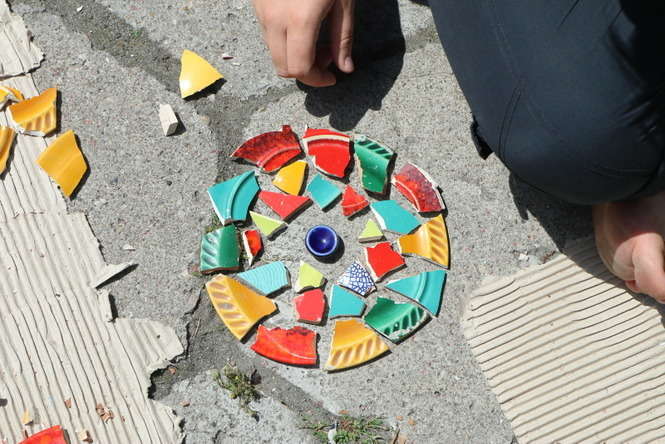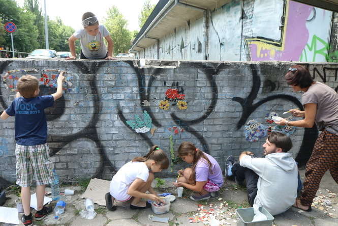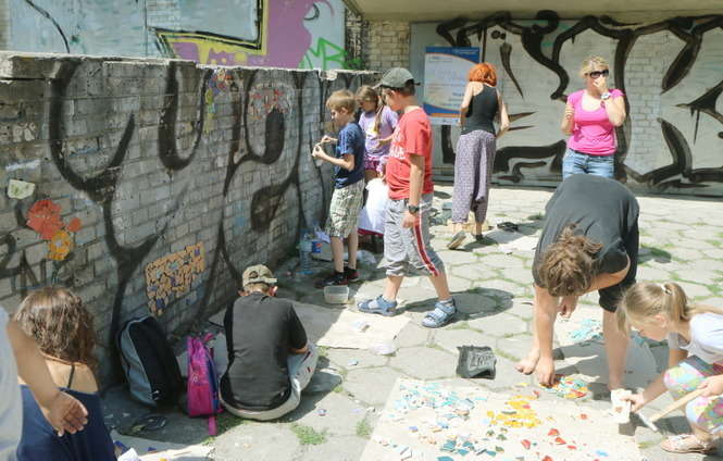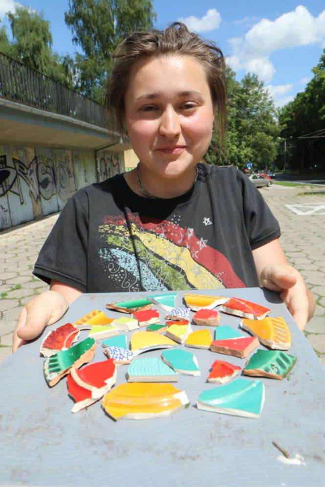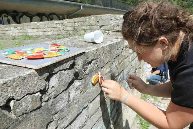 Młodzi adepci układania mozaiki pracowali na osiedlu im. J. Słowackiego. „Ze Sztuką po Sznurku” to cykl warsztatów jakie galeria Piękno Panie organizują przez lato dla dzieci i młodzieży. Fot. Maciej Kaczanowski