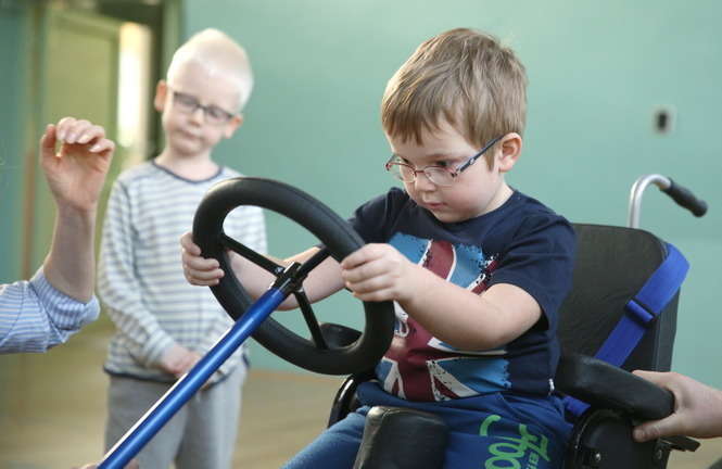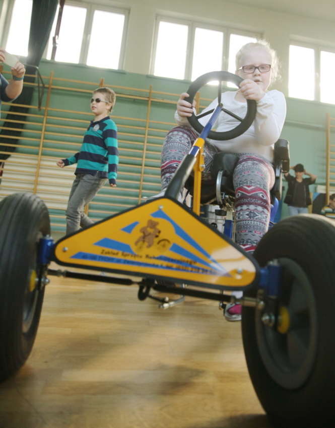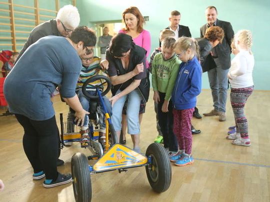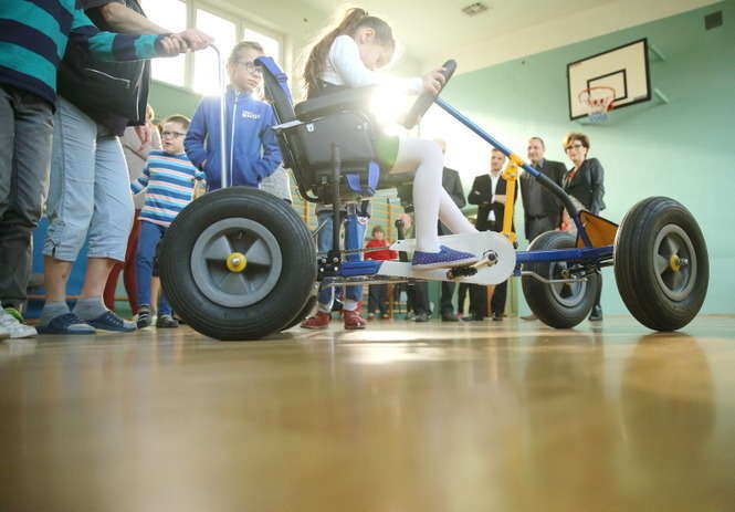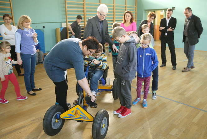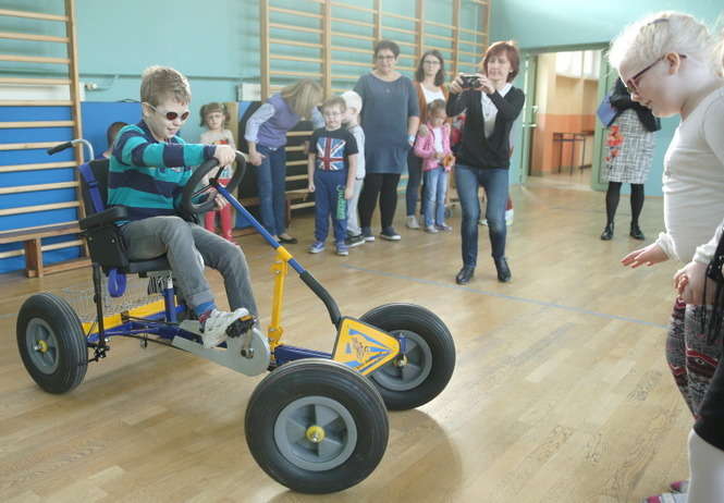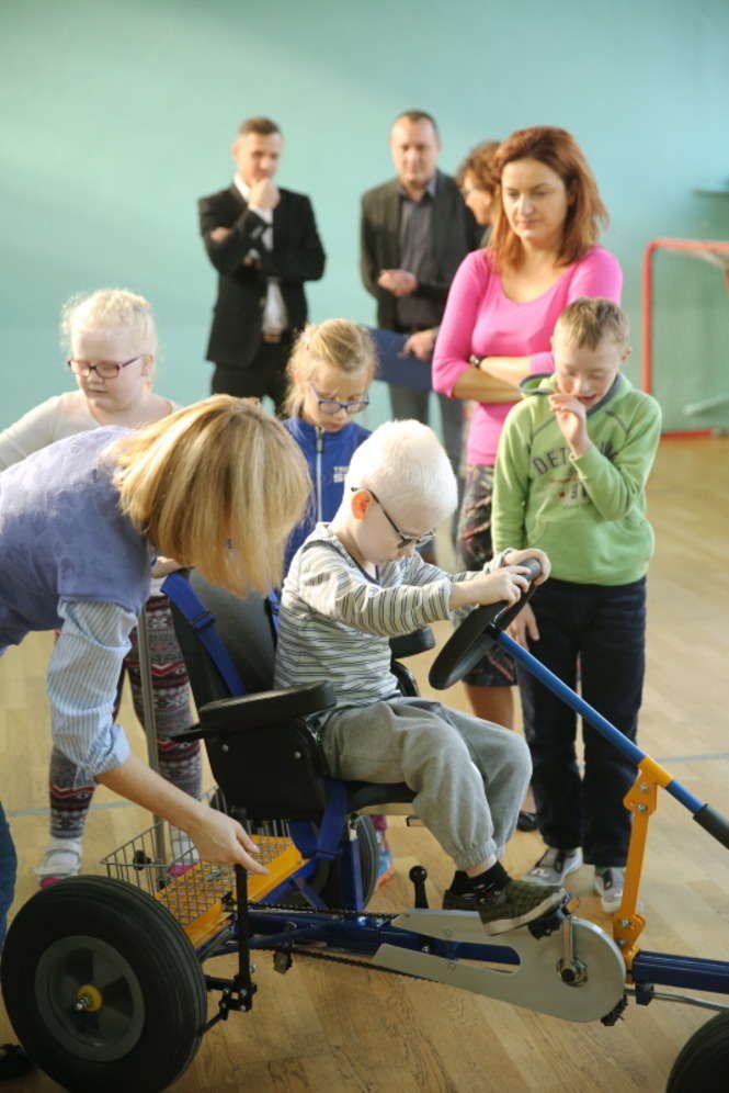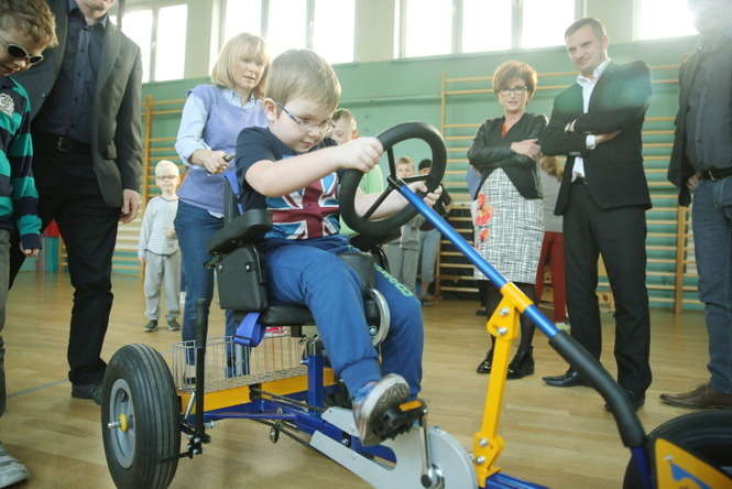 Czterokołowy rower z szerokimi oponami i z rączką umożliwiającą sterowania nim przez opiekuna podarowała Spółdzielnia Niewidomych wychowankom ze Specjalnego Ośrodka Szkolno Wychowawczego dla Dzieci i Młodzieży Niepełnosprawnych im. prof. Zofii Sękowskiej w Lublinie. Fot. Maciej Kaczanowski