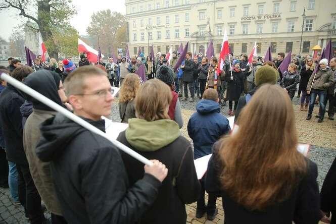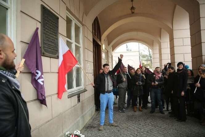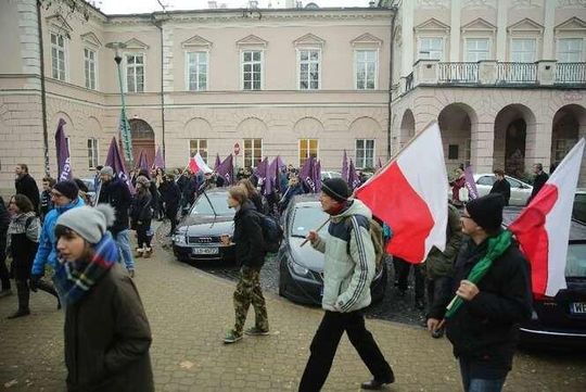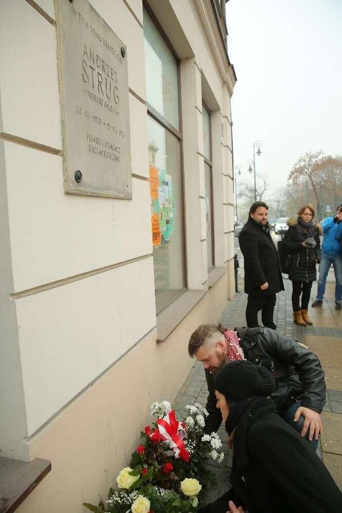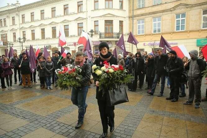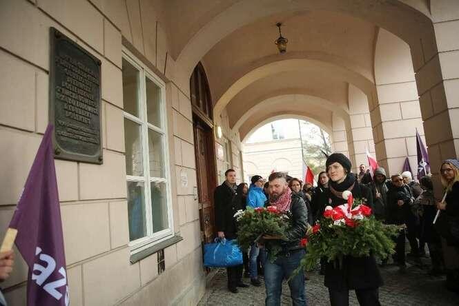 Partie Razem i PPS zorganizowały uroczystości upamiętniające powołanie w 1918 r. Tymczasowego Rządu Ludowego Republiki Polskiej. Z okazji 97 rocznicy powstania "rządu lubelskiego" uczestnicy manifestacji złożyli m. in. kwiaty przy pamiątkowej tablicy na budynku Politologii UMCS. Fot. Maciej Kaczanowski