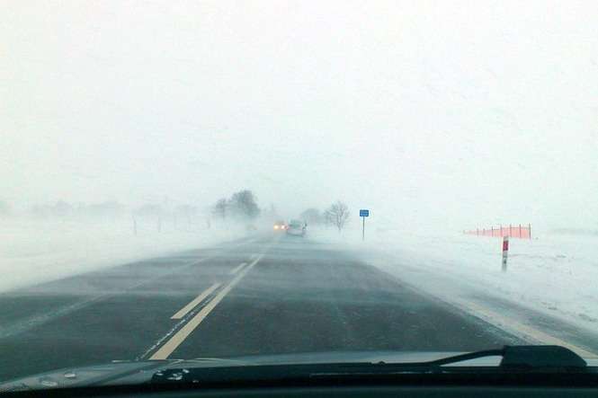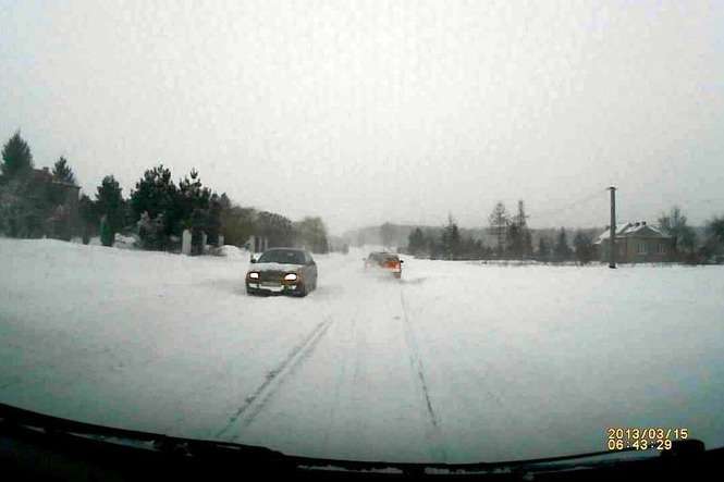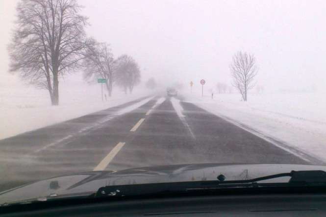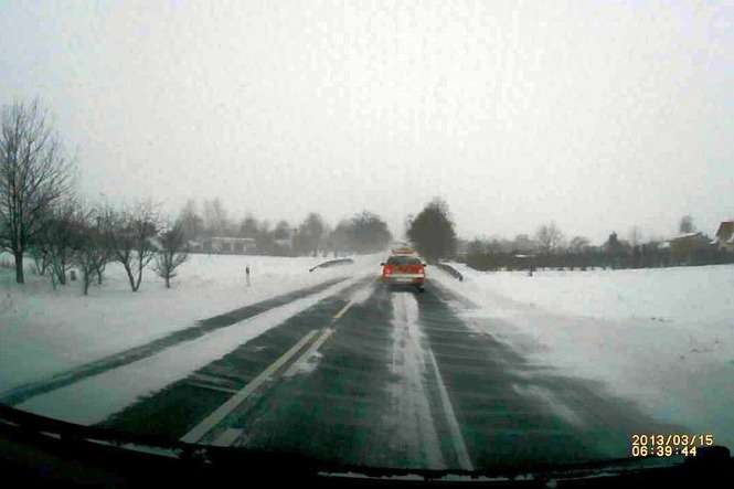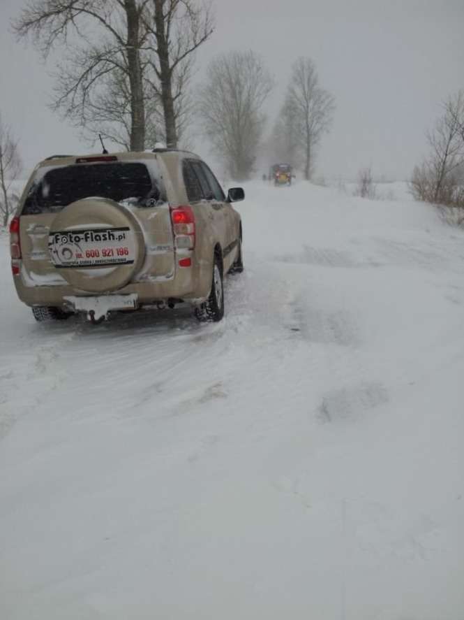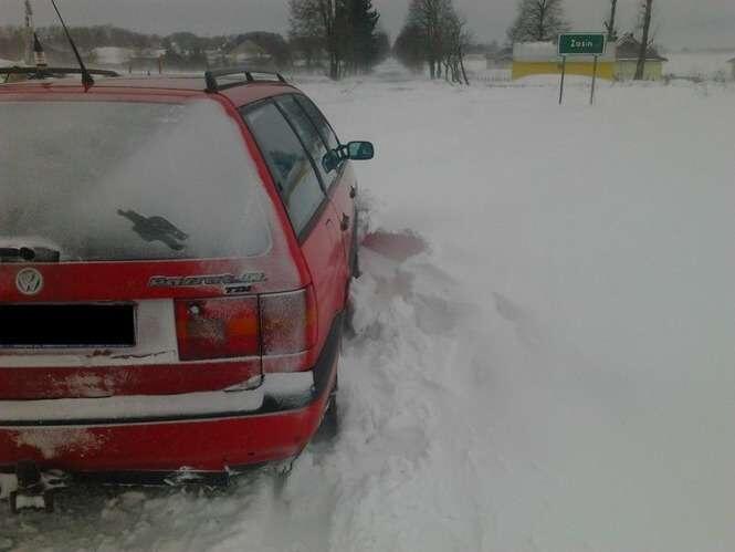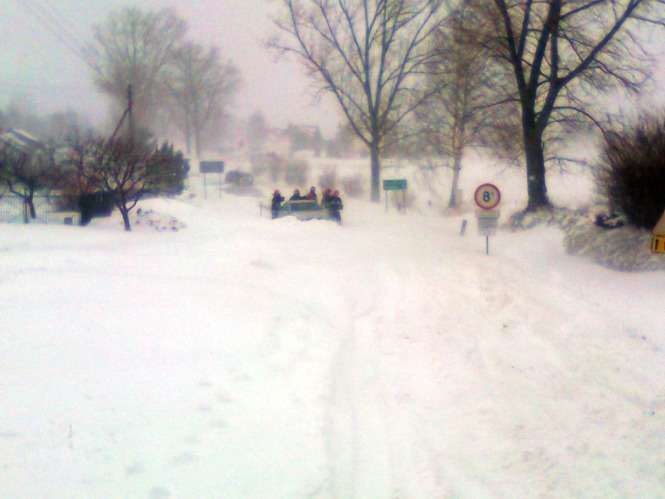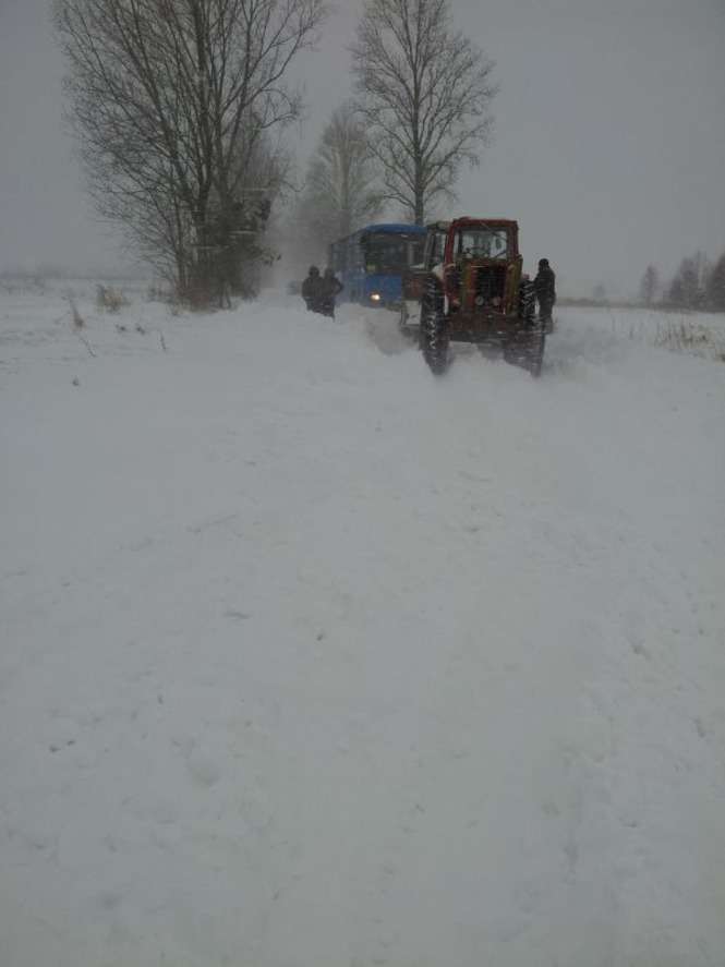 Droga powiatowa w Zemborzycach łącząca drogę krajową DK-19 i ul. Krężnicką. Ciągniki rolnicze wyciągają samochody, które utknęły w zaspach. Droga jest obecnie nieprzejezdna.
