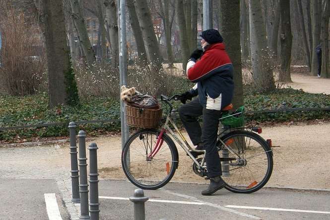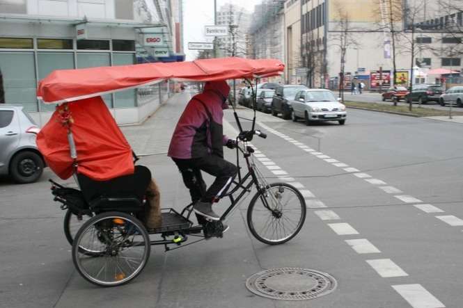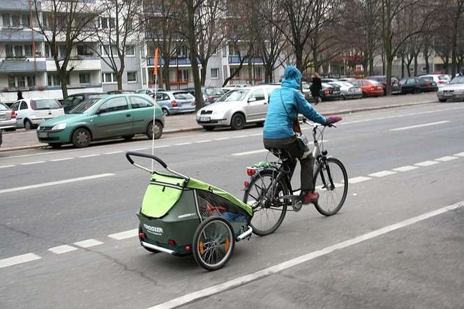 Zima wcale nie przeszkadza Berlińczykom w korzystaniu z rowerów. W przyczepce ciągniętej przez kobietę na rowerze siedzi małe dziecko
