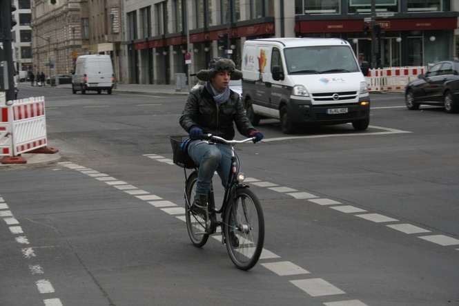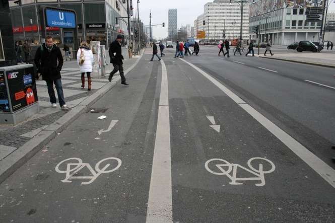 To oczywiste, że na prawie każdej każdej ulicy są ścieżki rowerowe. W niektórych miejscach (na zdjęciu Alexanderplatz) są nawet specjalne pasy dla rowerzystów przemierzających skrzyżowania w różnych kierunkach