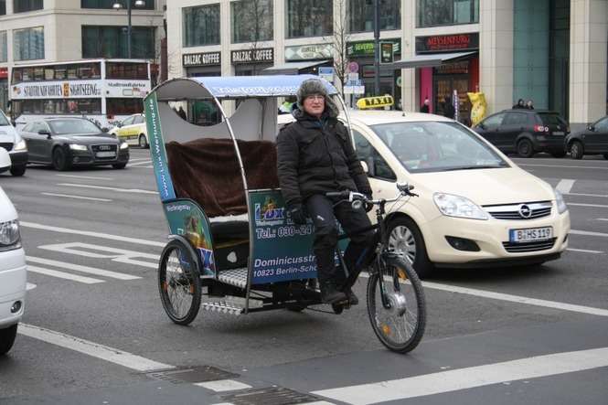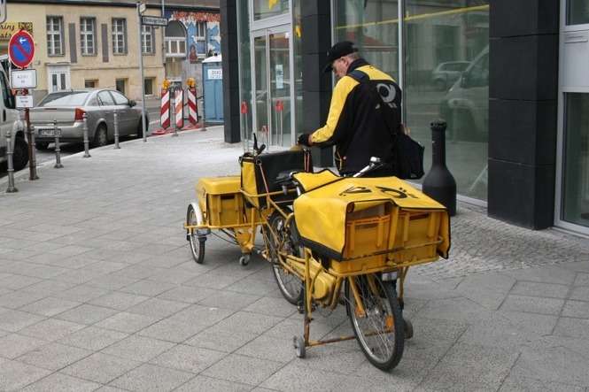 Również listonosze pracujący w zatłoczonym centrum Berlina korzystają z rowerów. Ten jest wyposażony w wersję z przyczepką