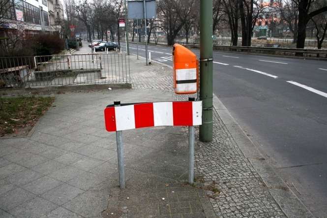 A w taki sposób rowerzyści są ostrzegani przed zwężeniem chodnika kilka metrów dalej. W tym miejscu ścieżka rowerowa się kończy