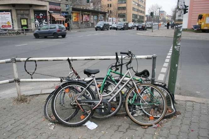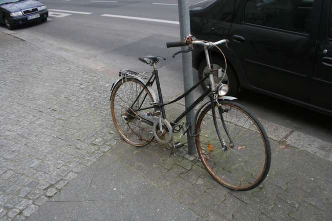 Stare, zdezelowane rowery są najczęściej spotykanymi śmieciami na ulicach Berlina. Ten stoi przy znaku drogowym już co najmniej od kilku miesięcy