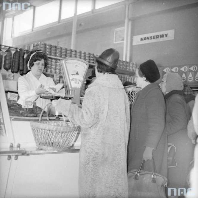 Sklep spożywczo-przemysłowy Warszawskiej Spółdzielni Spożywców Społem przy ul. Broniewskiego w Warszawie. Stoisko z wędlinami i konserwami.
