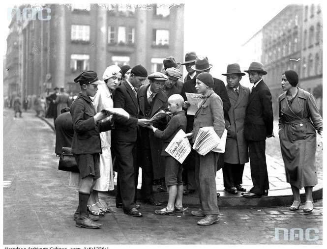 Kolejka do gazeciarza sprzedającego nadzwyczajne wydanie "Tempa Dnia" przed Pałacem Prasy.