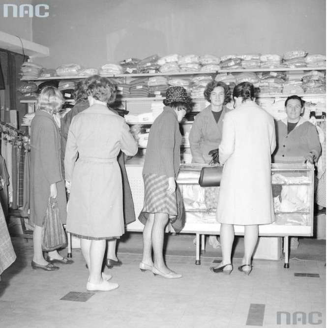 Sklep odzieżowy „Modna Pani” w Warszawie. Stoisko z konfekcją.