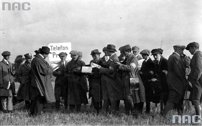 Tytuł tematu: Grupa dziennikarzy prasy polskiej i zagranicznej w kolejce do telefonu na wzgórzu pod Kowalewem.