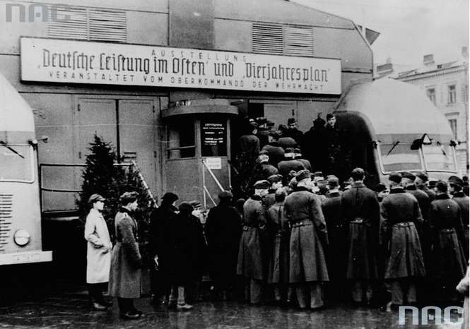 Żołnierze i ludność cywilna w kolejce przed pawilonem niemieckiej wystawy propagandowej "Plan czteroletni" na placu Adolfa Hitlera w Warszawie.