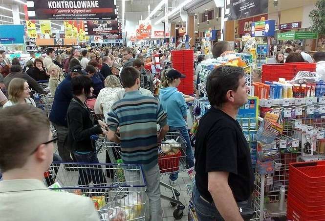 Klienci w kolejce do kasy w sklepie spożywczym przy pl. Inwalidów w Warszawie.