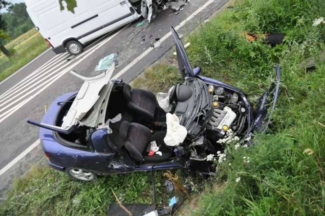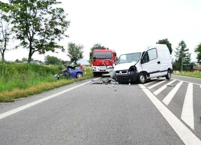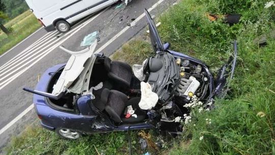 Policja informuje, że do wypadku doszło ok. godz. 4 rano. 30-letni kierowca jadąc oplem tigrą wyprzedzał szereg pojazdów, zjechał na przeciwległy pas drogi i zderzył się czołowo z busem renault.
