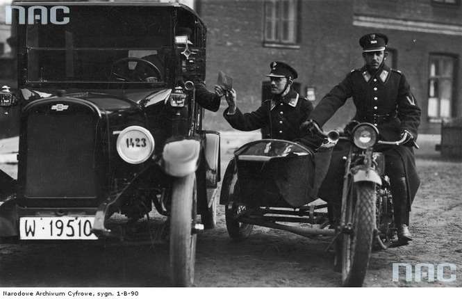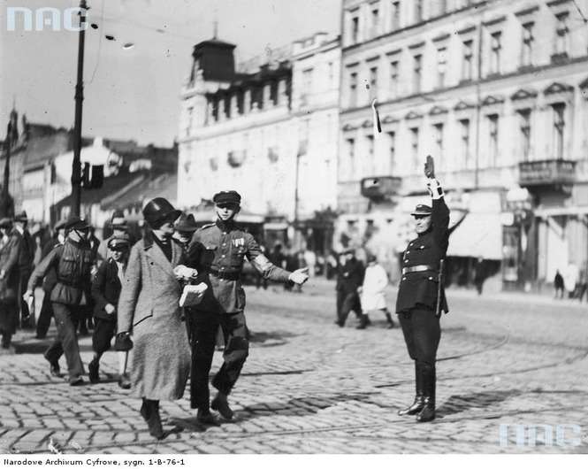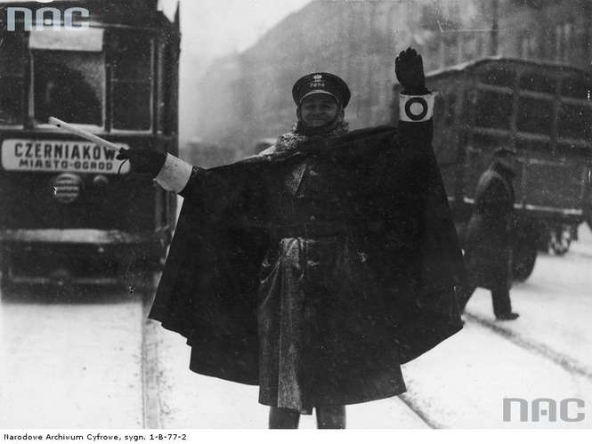 Zdjęcie z marca 1931 roku. Policjant kieruje ruchem na jednej z warszawskich ulic.