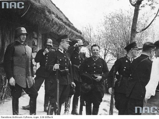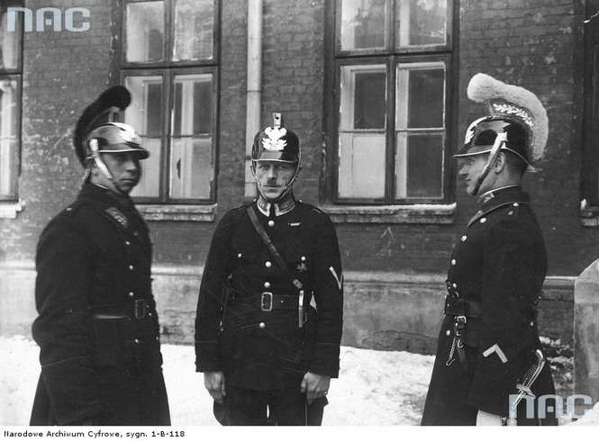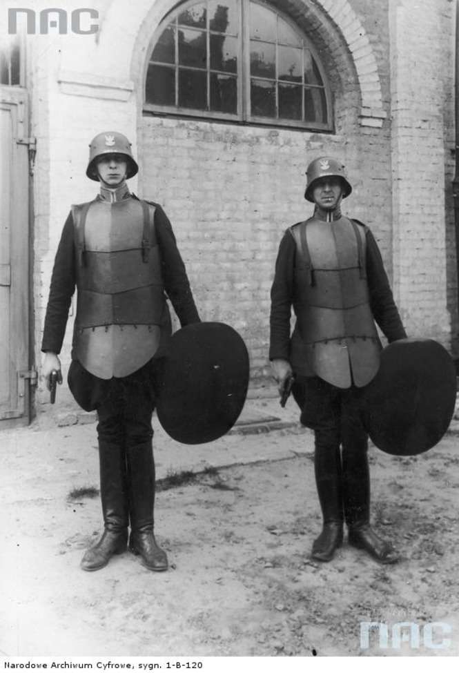 Funkcjonariusze warszawskiego oddziału specjalnego Policji Państwowej w strojach szturmowych - kuloodpornych zbrojach płytowych, hełmach wz.16 z orłami i numerem służbowym, tarczami i pistoletami: funkcjonariusz z lewej z Cebrą, z prawej z Mauserem M1914.