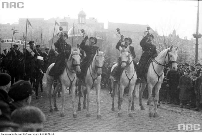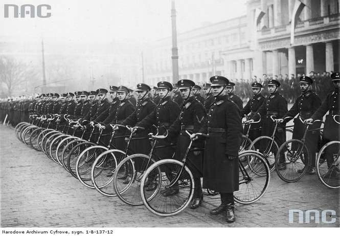 Rowerowe oddziały Policji Państwowej na placu Teatralnym.