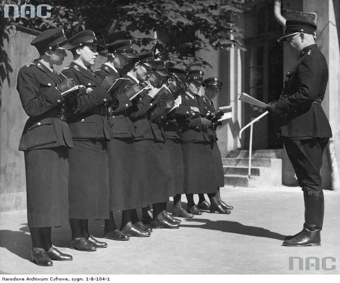 Referat policji kobiecej Centralnej Służby Śledczej w Łodzi. Odprawa policjantek przez inspektora Policji Państwowej Stanisława Polaka.