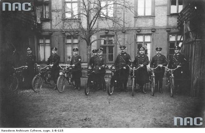 Funkcjonariusze Policji Państwowej z Torunia. Oddział policji wyposażony w motorowery. Zdjęcie z 1924 roku.
