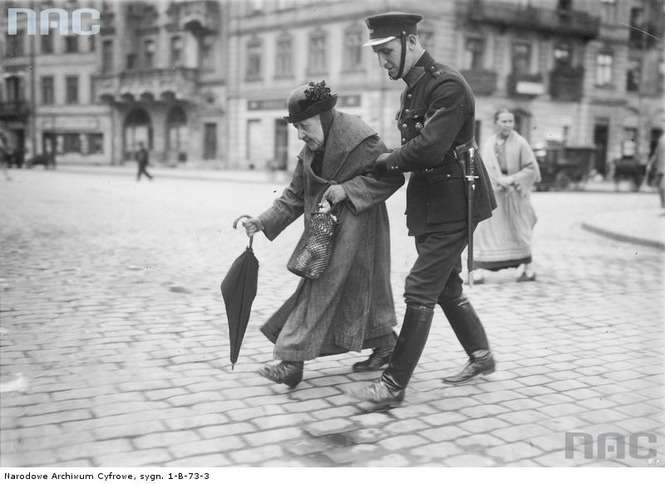 Zdjęcie z lipca 1925 roku. Policjant przeprowadza staruszkę przez ulicę w Warszawie.