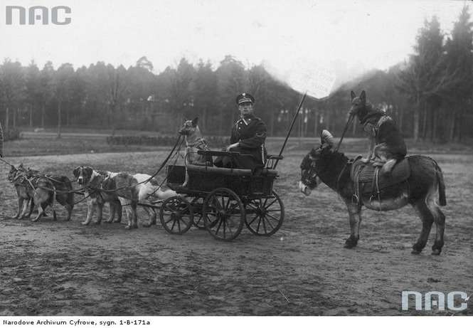 Tresura psów policyjnych na Cytadeli. Policjant z psem trzymającym w pysku lejce, w wózku zaprzężonym w dwie pary psów. Obok widoczny także pies siedzący na ośle.