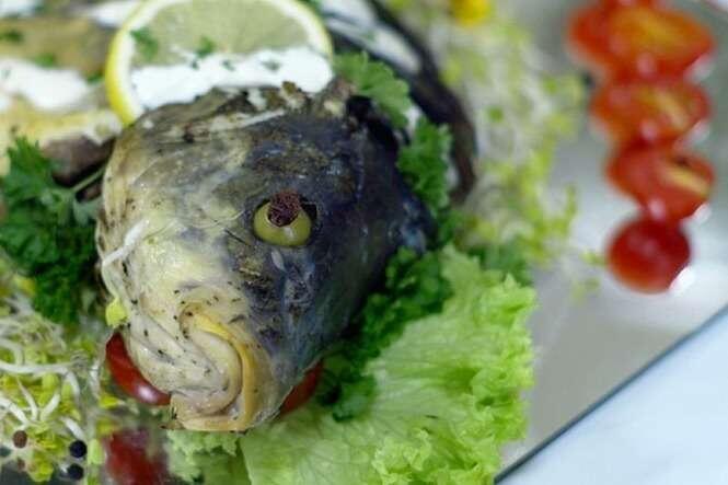 Składniki: 1 karp, 5 pokrojonych cebul, rodzynki i migdały według uznania, sól i pieprz. Na wywar: głowy i mięso z karpia, 3 marchewki, kawałek selera, 1 pietruszka, 2 cebule, 2 listki laurowe, ziele angielskie.