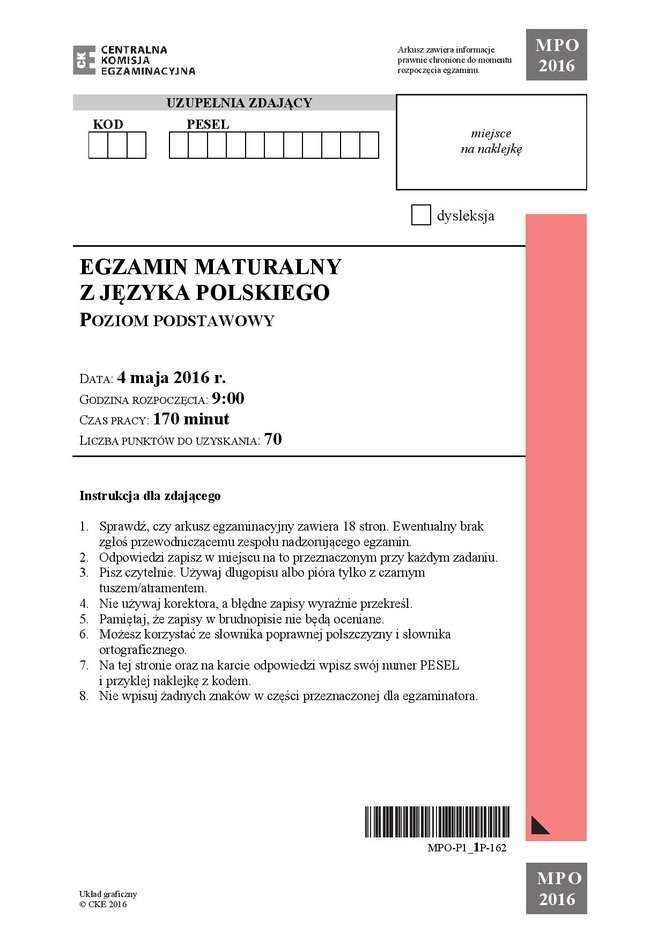 Matura 2016: język polski (poziom podstawowy) - ARKUSZ CKE
