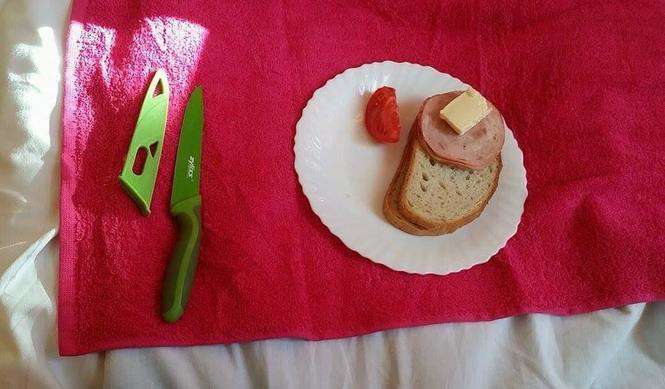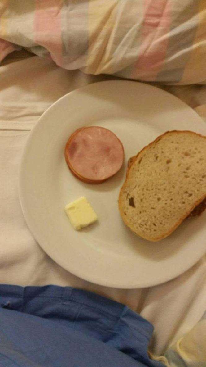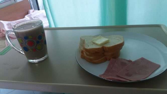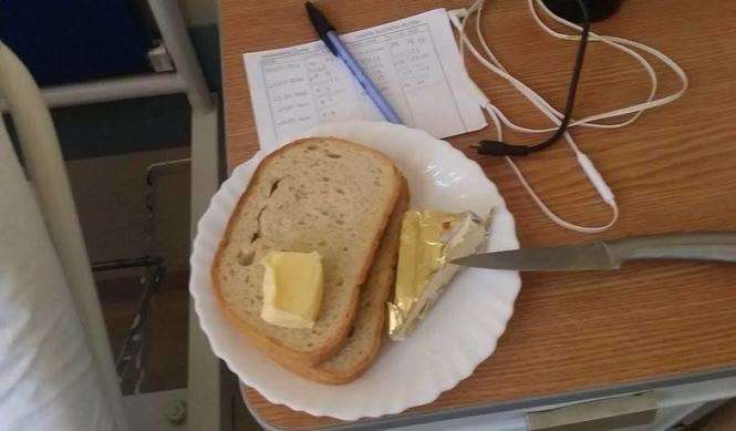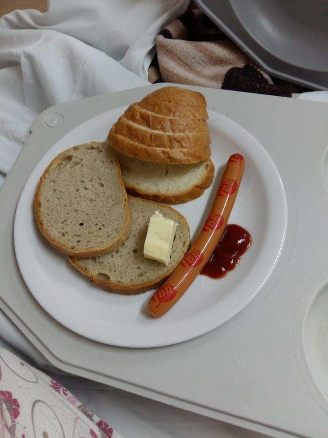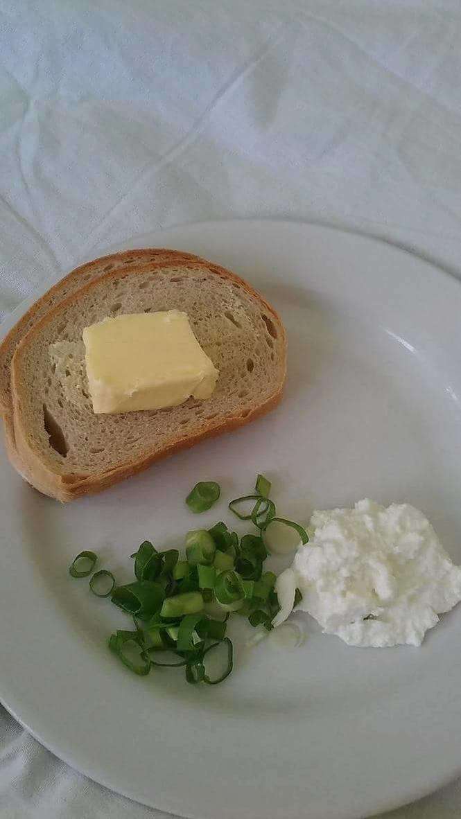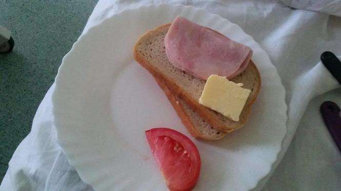 Kolacja mojej żony, jak była w ciąży (masło ja kupiłem). Wojewódzki Szpital w Lublinie przy Kraśnickich (ale w każdym szpitalu tak karmią). Po porodzie nic się nie zmieniło i dalej otrzymywała porcję, jak dla niemowlaka. Pozdrawiam czytelnik