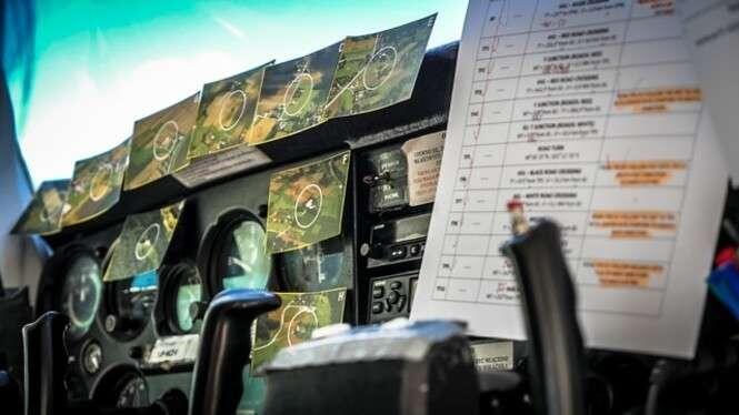 Tak wygląda kokpit samolotu przed konkurencją zawodniczą - poobklejany zdjęciami które trzeba znaleźć na trasie