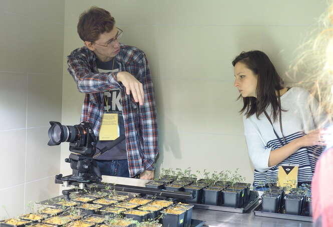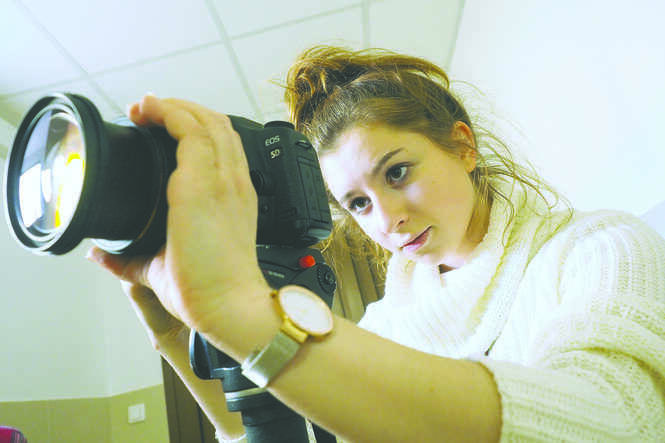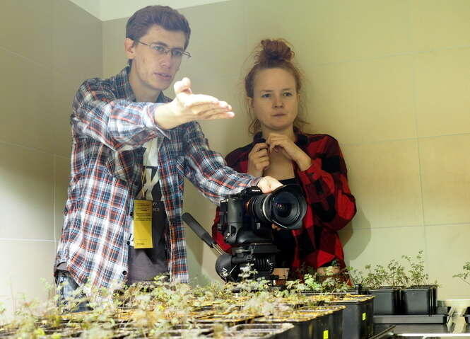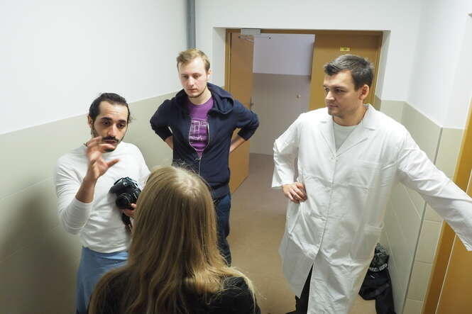 Anna Troyanskaya z Rosji i operator Jacek Lewandowski na planie filmowym Kinojadów w pomieszczeniach Wydziału Biologii i Biotechnologii UMCS