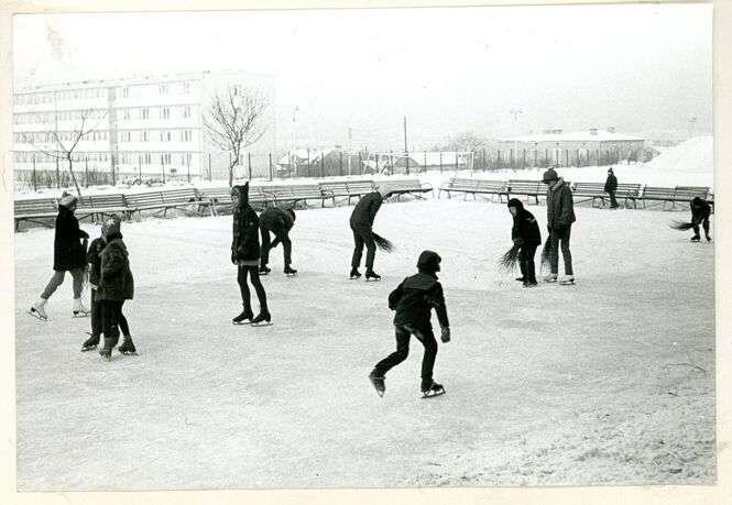 Lodowisko przy Szkole Podstawowej nr 31 przy ul. Lotniczej 1. Modele łyżew i urządzenia do utrzymania tafli sugerują czasy PRL-u.