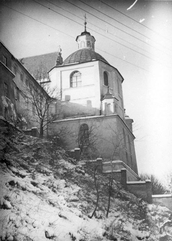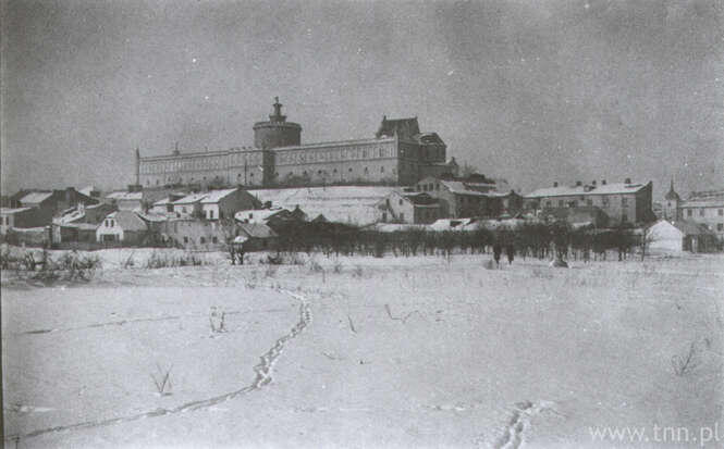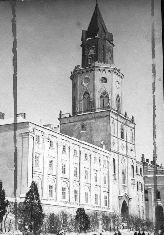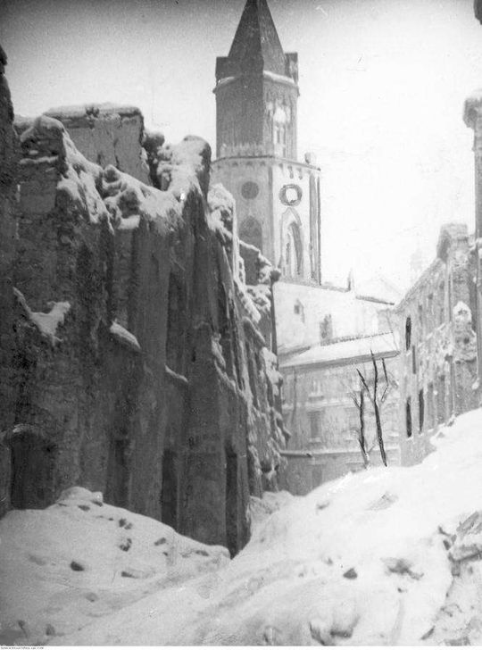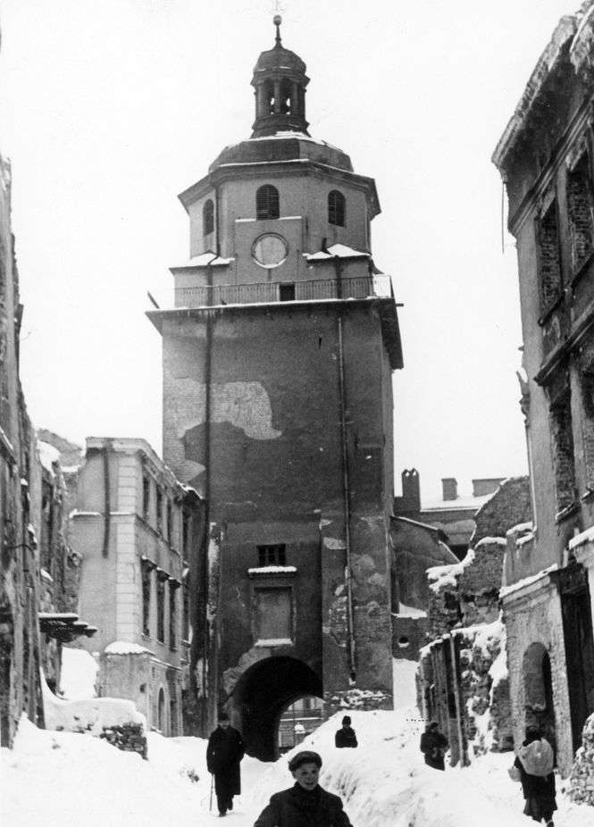 Zniszczone budynki w Lublinie. Widoczna wieża kościoła.