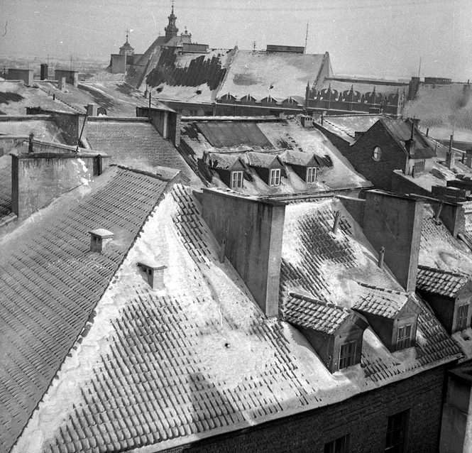 Fragment getta utworzonego w śródmieściu Lublina. Widoczne zabytkowe kamieniczki.