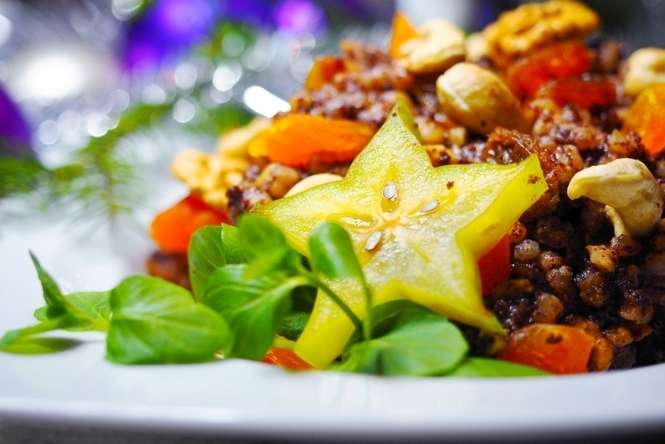 Składniki: 20 dag pszenicy, 10 dag rodzynek królewskich, 10 dag orzechów włoskich łupanych, 10 dag orzechów nerkowca, 40 dag maku, 15 dag moreli kandyzowanych, 4 duże łyżki miodu, 1 pomarańcza, 50 ml rumu.