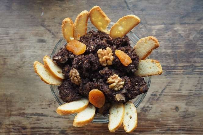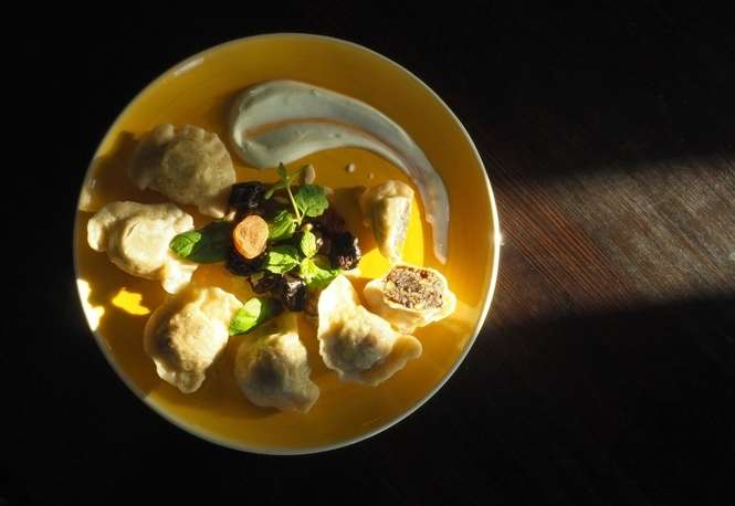 Wykonanie: suszone śliwki namoczyć w wywarze z cynamonu, pomarańczy i miodu, pozostawić na około 2 godzin. Dokładnie osączyć. Orzechy zmielić i wymieszać z miodem i skórką pomarańczy. Masa ma być gęsta. Faszerować śliwki orzechową masą tak, by były dość pękate. Przygotować pierogowe ciasto. Rozwałkować i wycinać koła, następnie faszerować wcześniej przygotowana masą (około 25 gram farszu). Gotować we wrzątku do wypłynięcia. Podawać polane ze śmietaną, miodem i cynamonem. (Marek Panek)