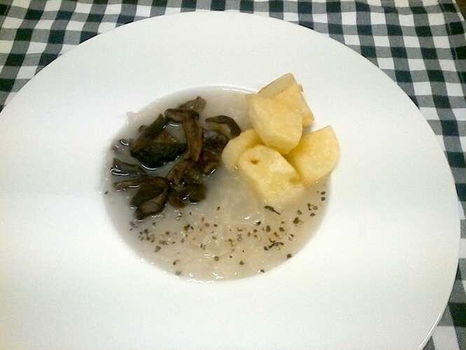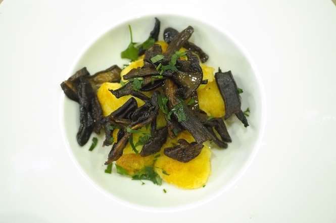 Wykonanie: kapelusze wymoczyć w mleku. Ziemniaki obrać i ugotować. Po ugotowaniu odcedzić i zasypać mąką oraz zalać olejem rzepakowym (około 80 ml). Dopiero wtedy utłuc ziemniaki. Dawniej potrawa z takich ziemniaków, nazywana była lemieszką lub psiochą. Grzyby odcedzić z mleka i smażyć na oleju rzepakowym. Doprawić solą i pieprzem. Podawać na lemieszce. (Szymon Boguta).