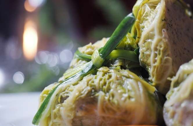 Składniki: 10 dużych liści z kapusty włoskiej, 1,2 kg świeżego sandacza, 2 pęczki kopru, 2 cebule, 1 por, sól, pieprz do smaku.