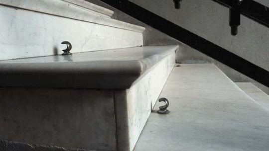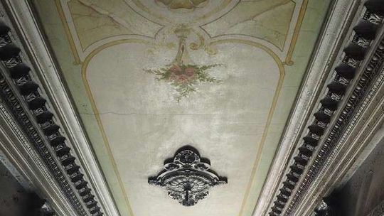 Sztuczny pilaster udaje, że podpiera: gzyms udający głowicę greckiej kolumny i owalny kartusz z datą MCMX–MCMXI. Cały w kamiennych laurach, jak pomnik. Od podwórka tylko data 1911. Od frontu obfite kamienne girlandy kapią z obu boków bramy. Mniejsze sięgają okien pierwszego piętra.