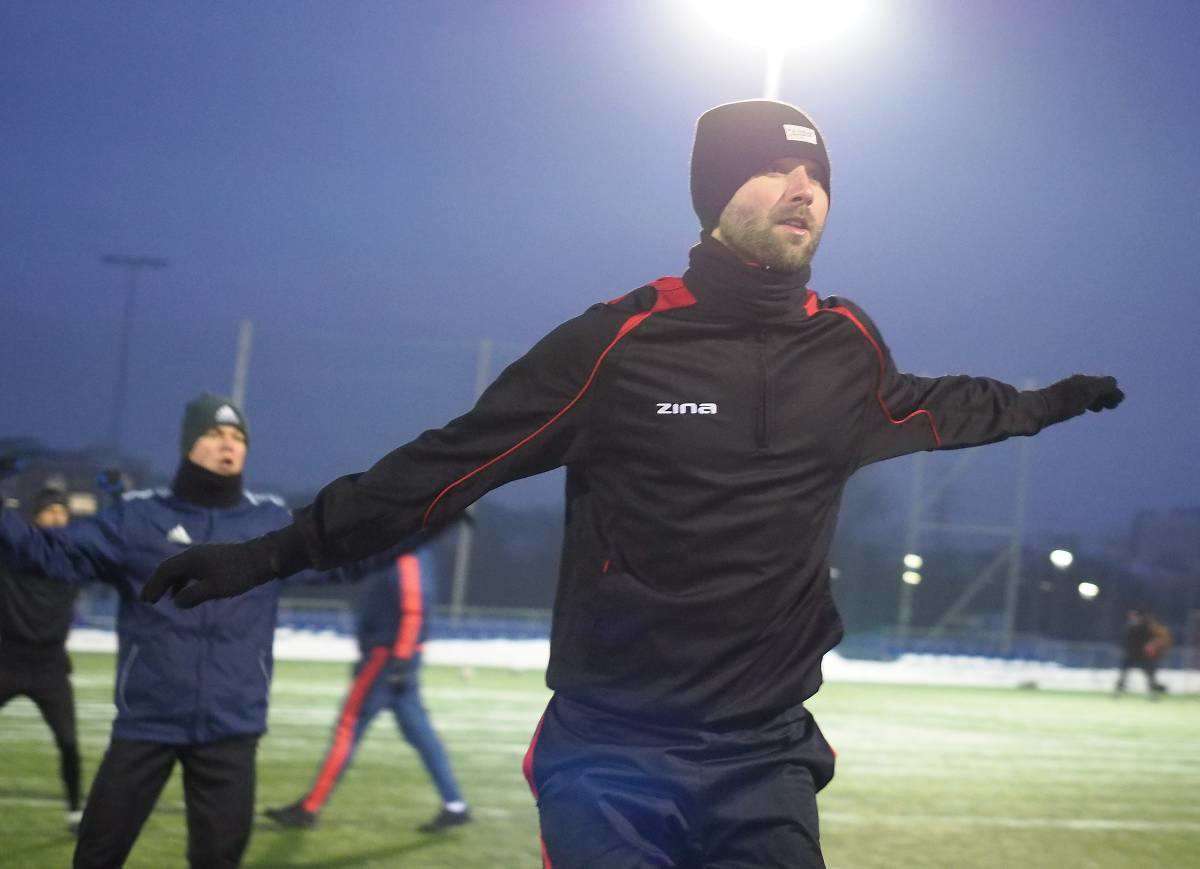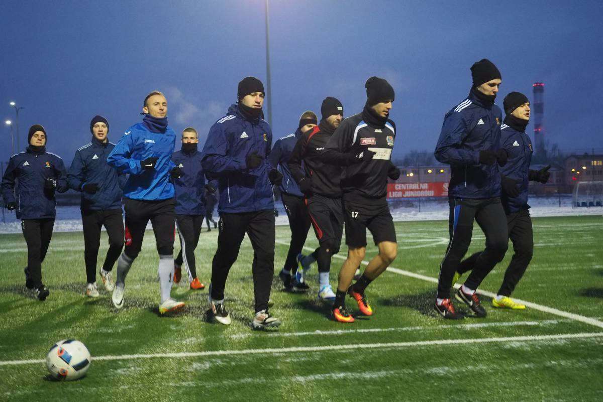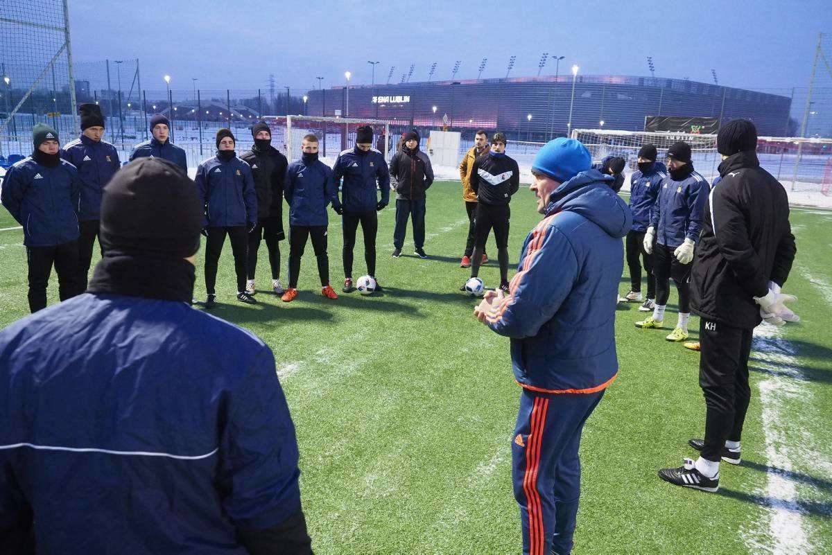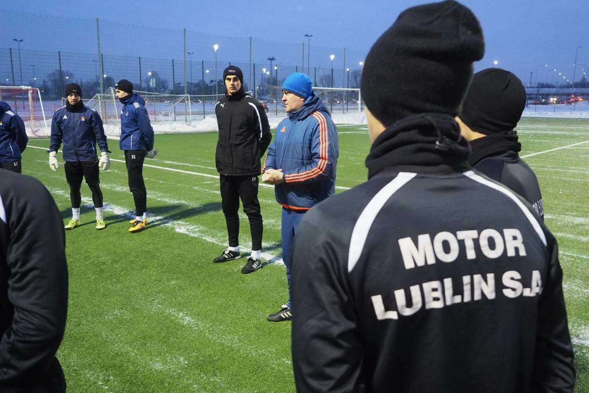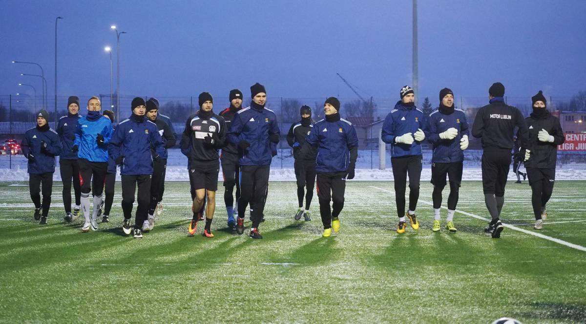 Pierwszy raz w tym roku piłkarze Motoru wybiegli na boczne boisko stadionu Arena. Zajęcia poprowadził Marcin Sasal - nowy trener lubelskiej drużyny. Fot. Maciej Kaczanowski