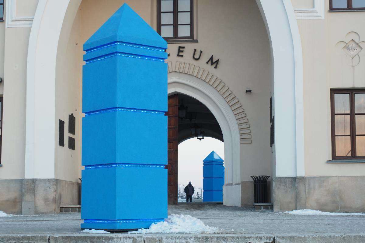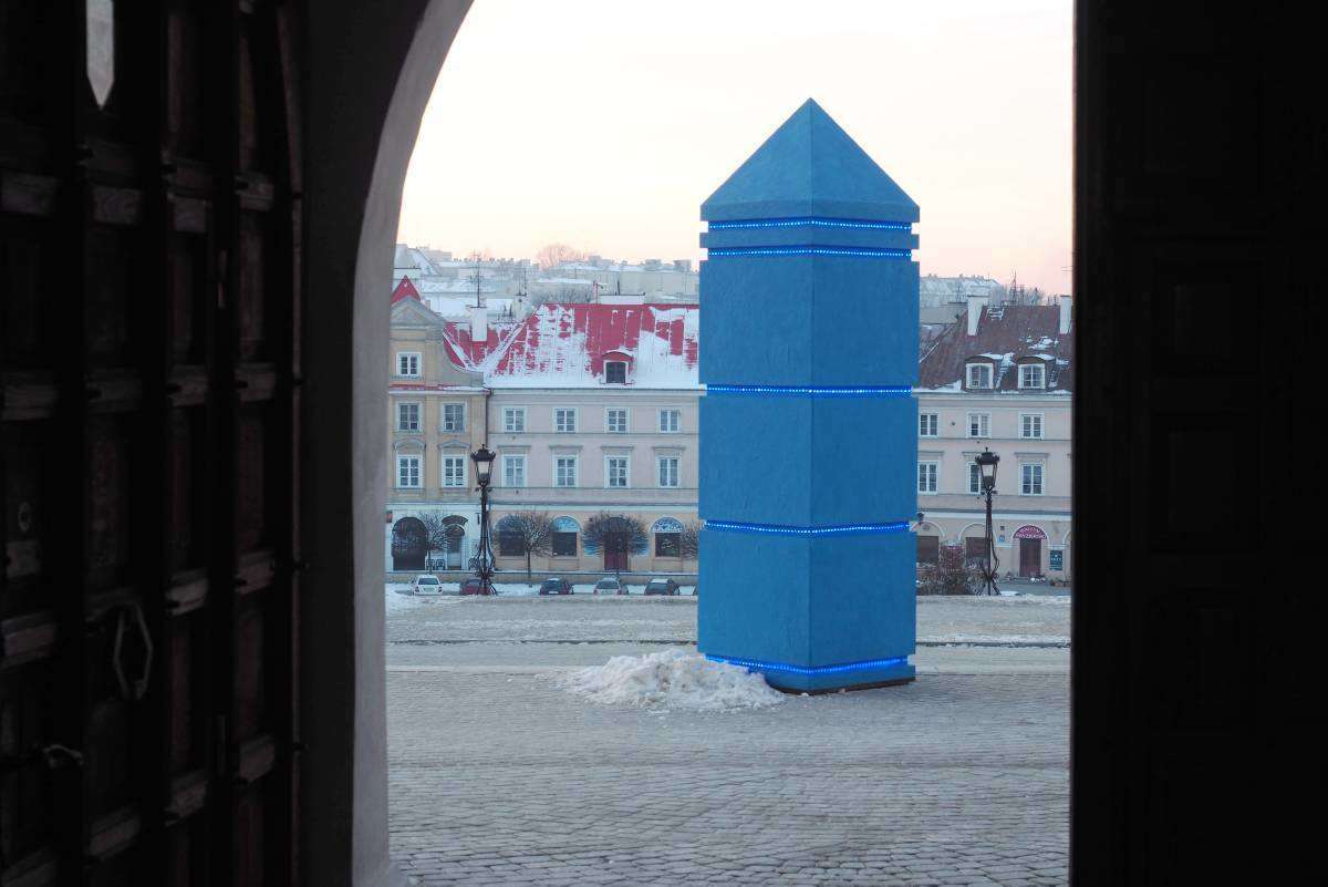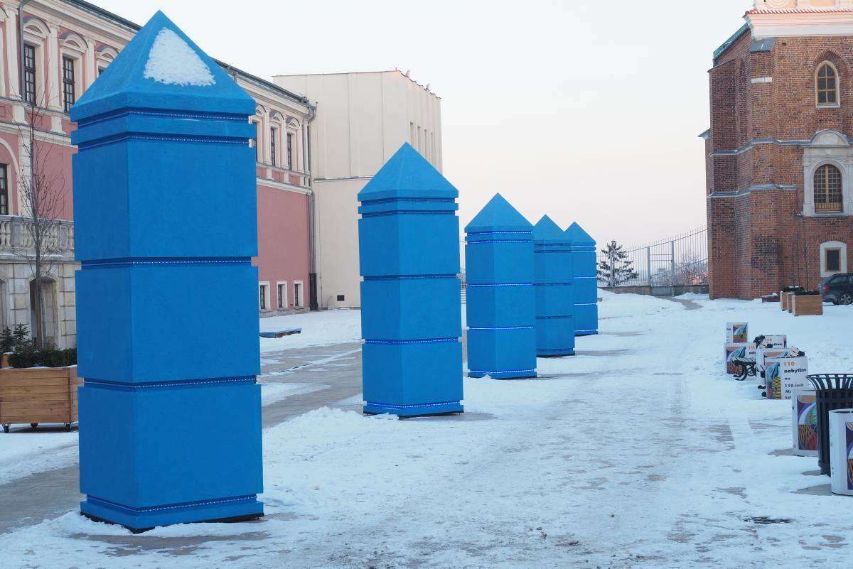 "Sześć błękitnych obelisków" to zapowiedź styczniowej wystawy "Małe Muzeum Drobnych Przejawów Mąki oraz inne wątki". Ta realizacja sumuje doświadczenia artysty związane z poczuciem wolności i je ujawnia poprzez błękit obelisków i błękit światła, które w nich jest zawarte i będzie funkcjonować bez przerwy do zakończenia ekspozycji. Fot. Maciej Kaczanowski