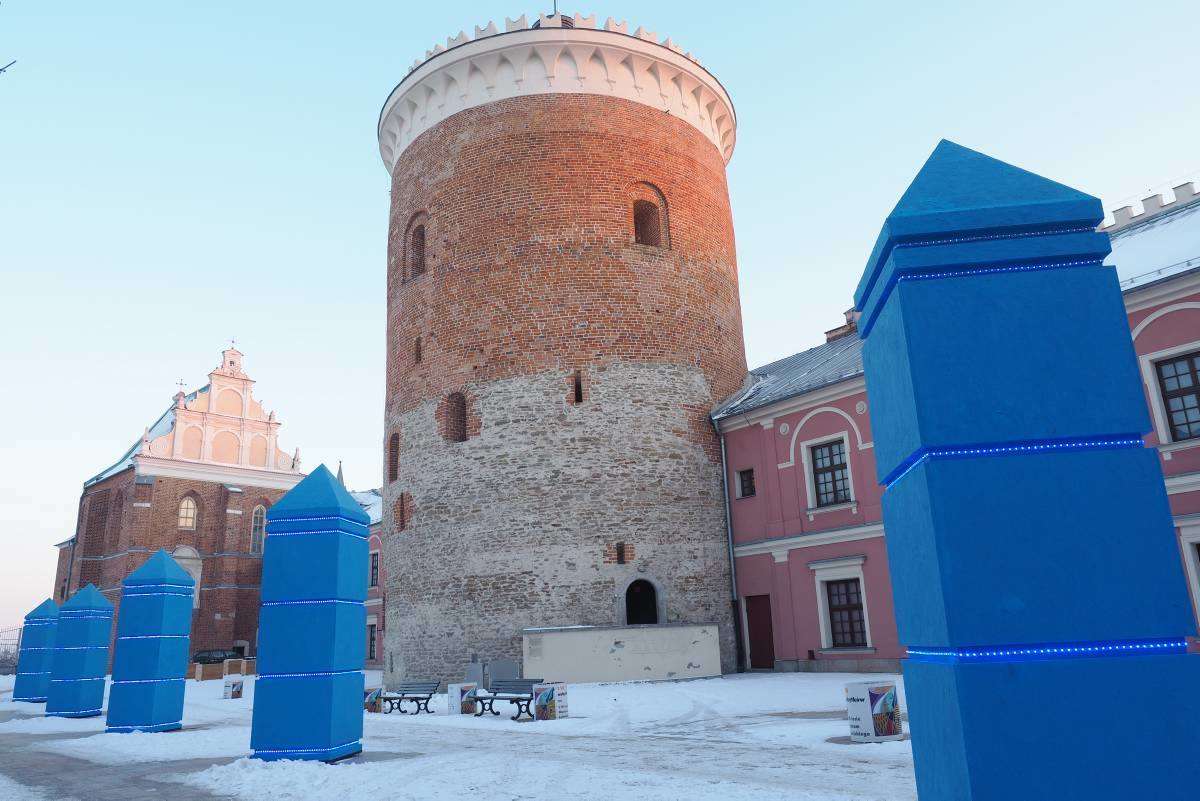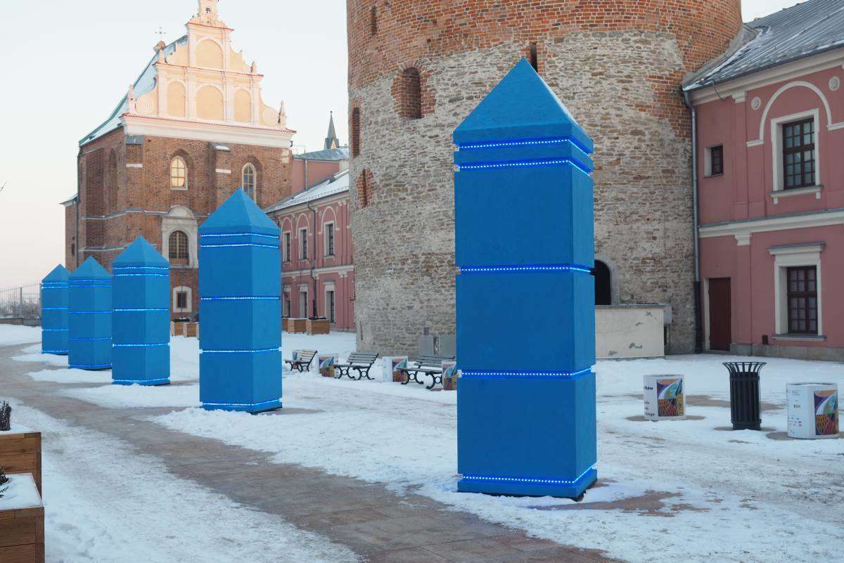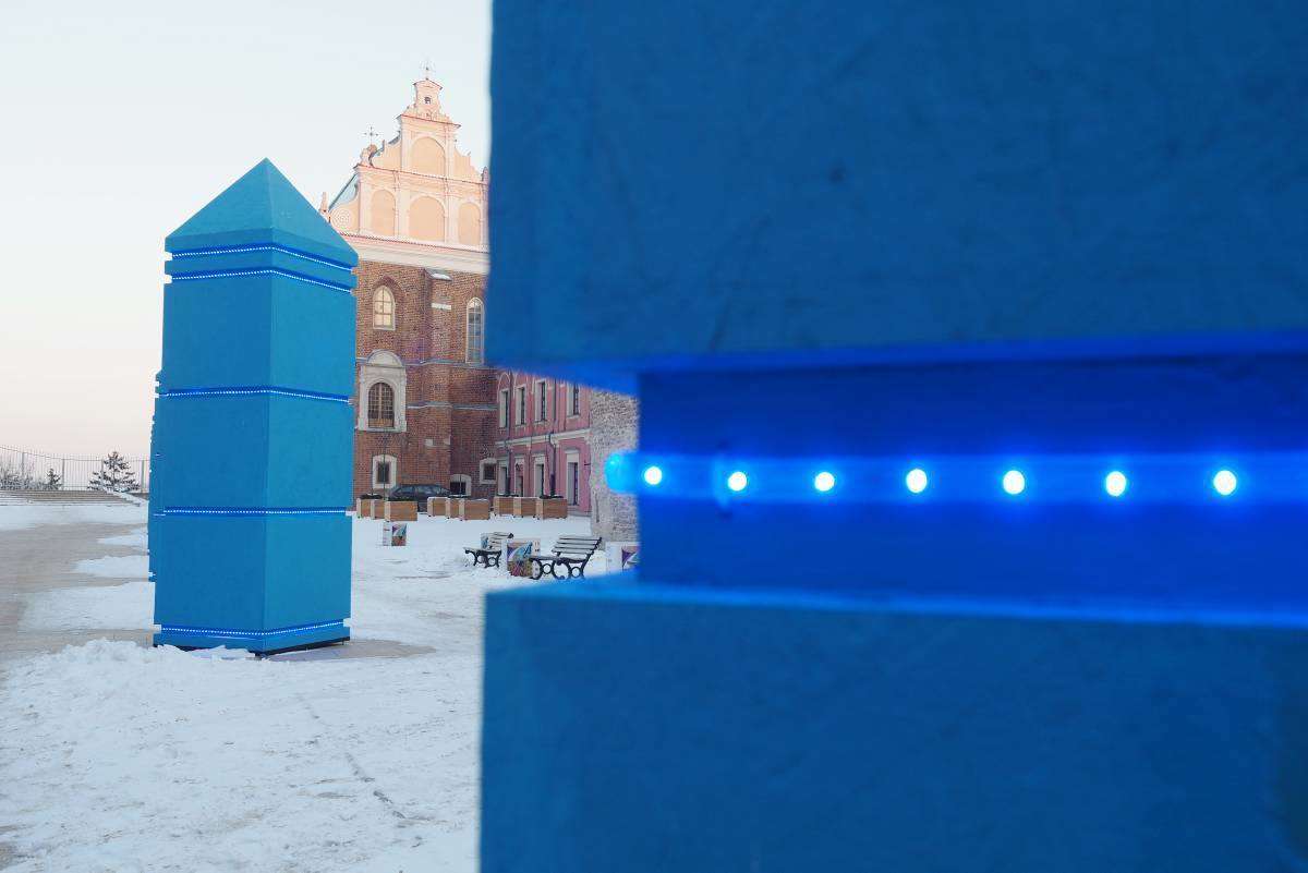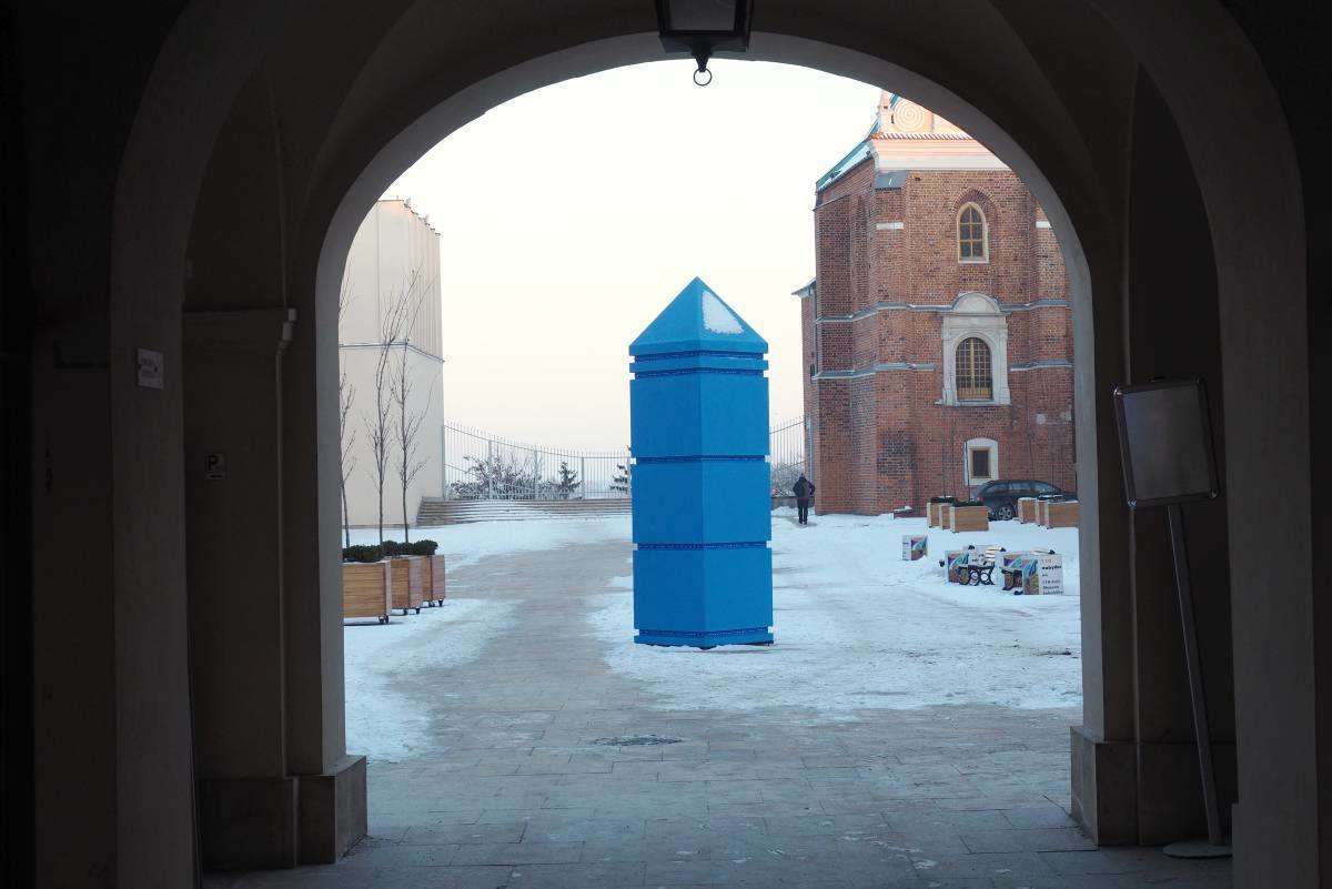 "Sześć błękitnych obelisków" to zapowiedź styczniowej wystawy "Małe Muzeum Drobnych Przejawów Mąki oraz inne wątki". Ta realizacja sumuje doświadczenia artysty związane z poczuciem wolności i je ujawnia poprzez błękit obelisków i błękit światła, które w nich jest zawarte i będzie funkcjonować bez przerwy do zakończenia ekspozycji. Fot. Maciej Kaczanowski