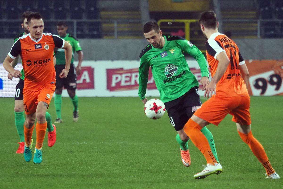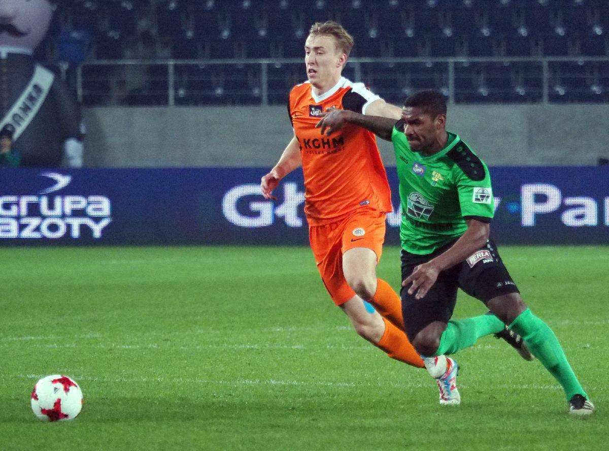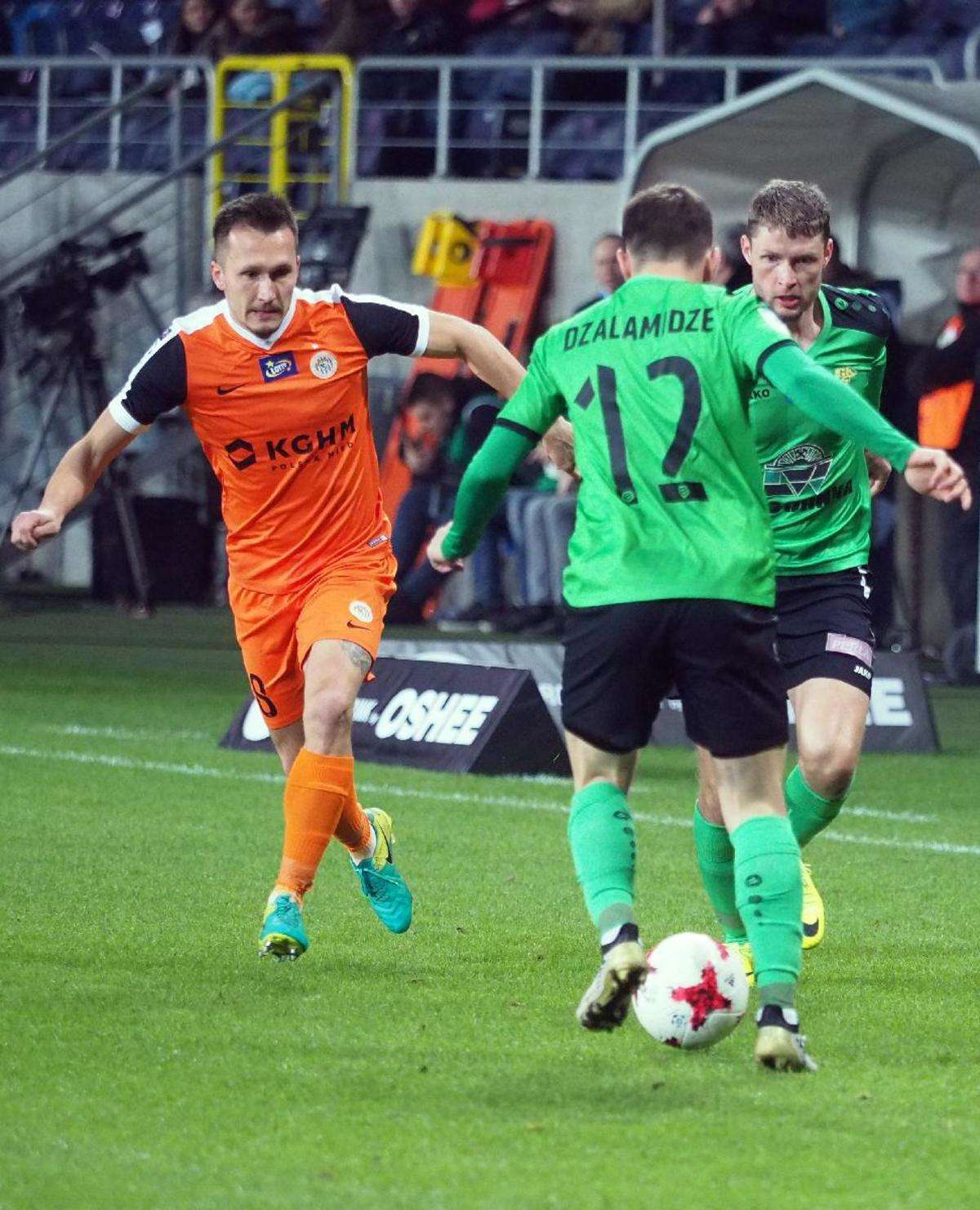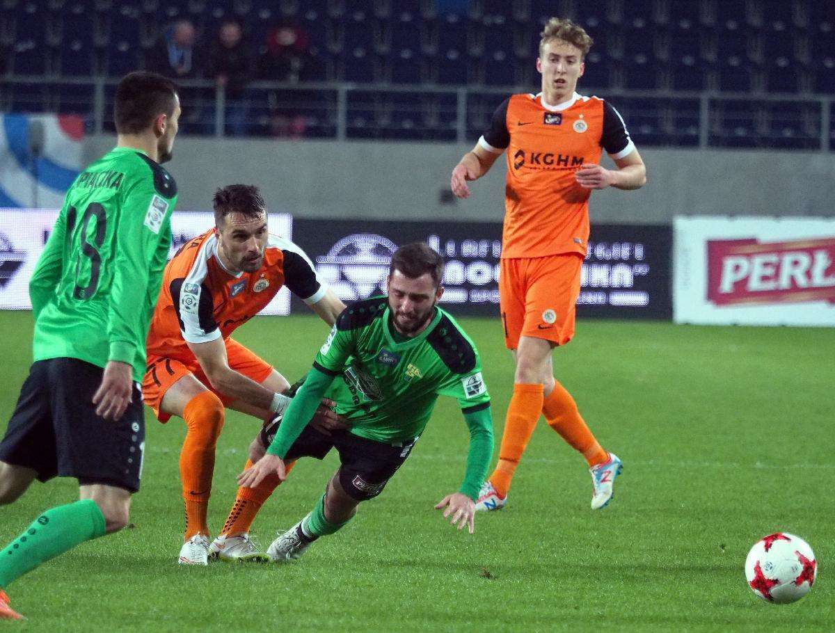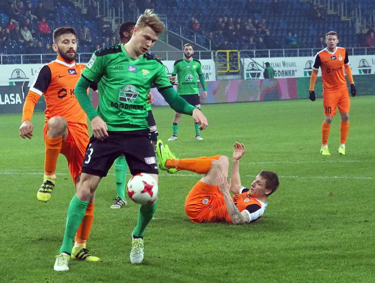 Górnik Łęczna przegrał z Zagłębiem Lubin 0:1 w zaległym spotkaniu 21. kolejki. Gola na wagę trzech punktów dla gości strzelił w 5 minucie spotkania Filip Starzyński. Fot. Maciej Kaczanowski