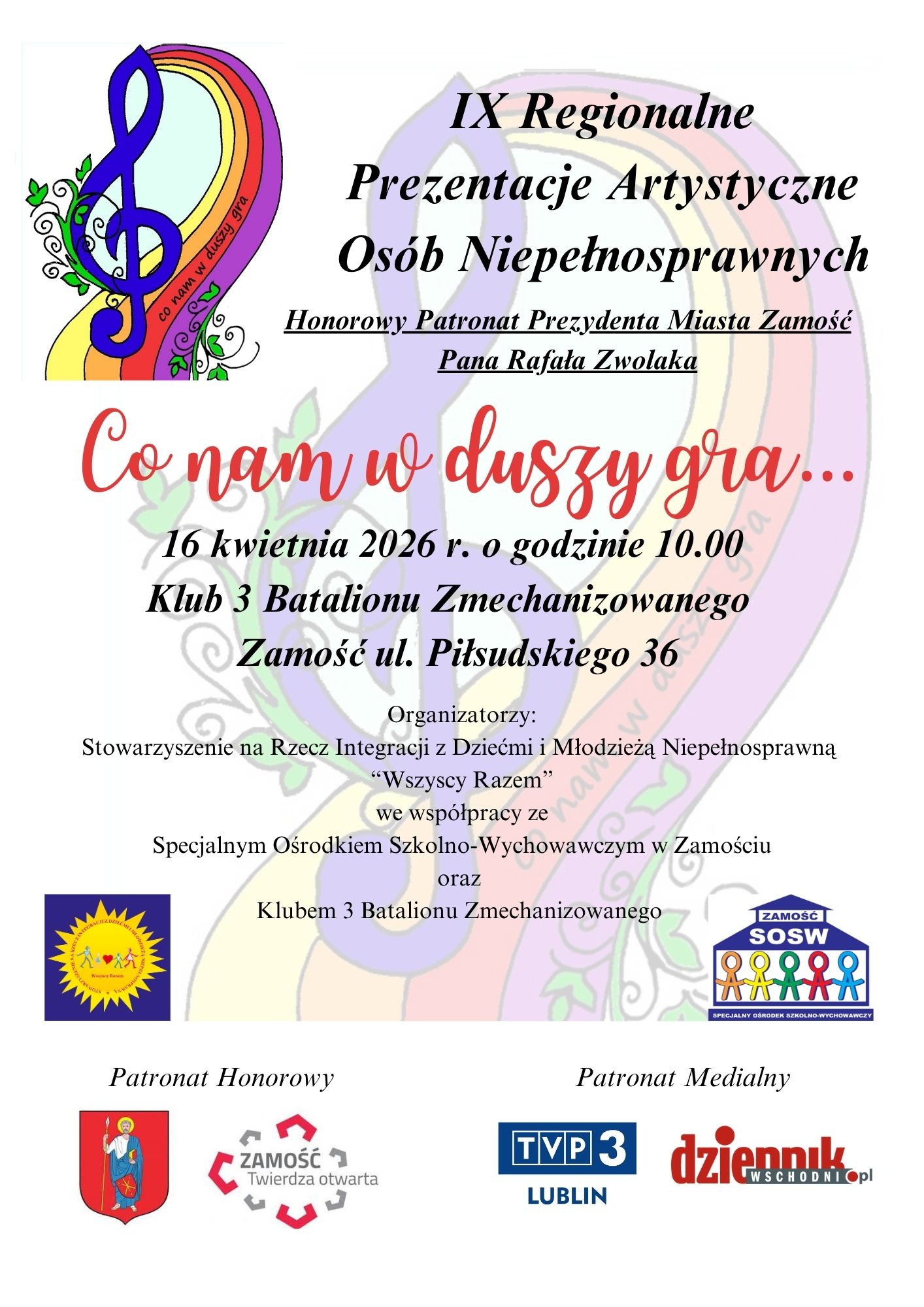 Przed nami IX Regionalny Przegląd Artystyczny Osób Niepełnosprawnych „Co nam w duszy gra…”. Wydarzenie odbędzie się 16 kwietnia 2026 roku o godz. 10 w Klubie 3 Batalionu Zmechanizowanego w Zamościu. Na scenie zaprezentują się młodzi artyści z regionu – uczestnicy szkół, ośrodków i warsztatów terapii zajęciowej, którzy wystąpią w formie wokalnej, instrumentalnej i tanecznej. Celem przeglądu jest integracja poprzez sztukę oraz promocja talentów osób z niepełnosprawnościami.