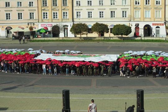 Licealiści Lublinowi: flaga miasta ułożona z parasolek na pl. Zamkowym