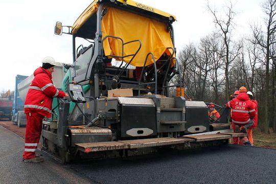 Rozściełacz kładzie gorącą warstwę nowego asfaltu w okolicy węzła "Dęblińska"