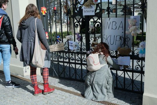 Pluszaki na bramie kurii na znak solidarności z ofiarami księży pedofilów