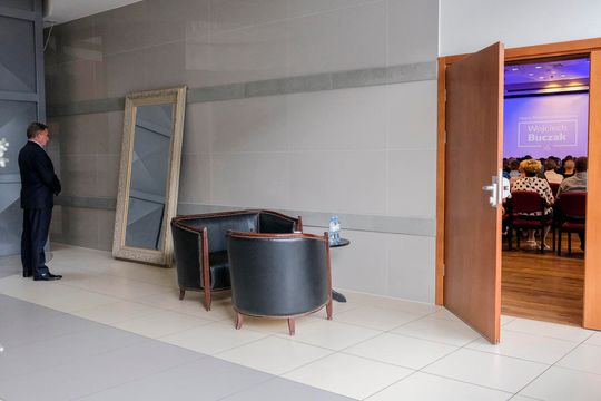 Rzeszów. Poseł Wojciech Buczak, kandydat PiS na prezydenta Rzeszowa, na chwilę przed wejściem na scenę podczas konwencji programowej partii.