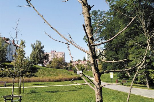 Uschnięte drzewa w parku Zawilcowa